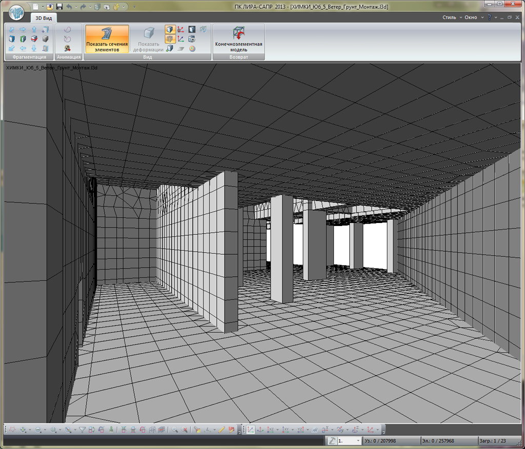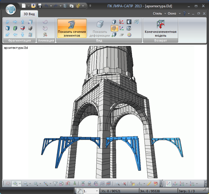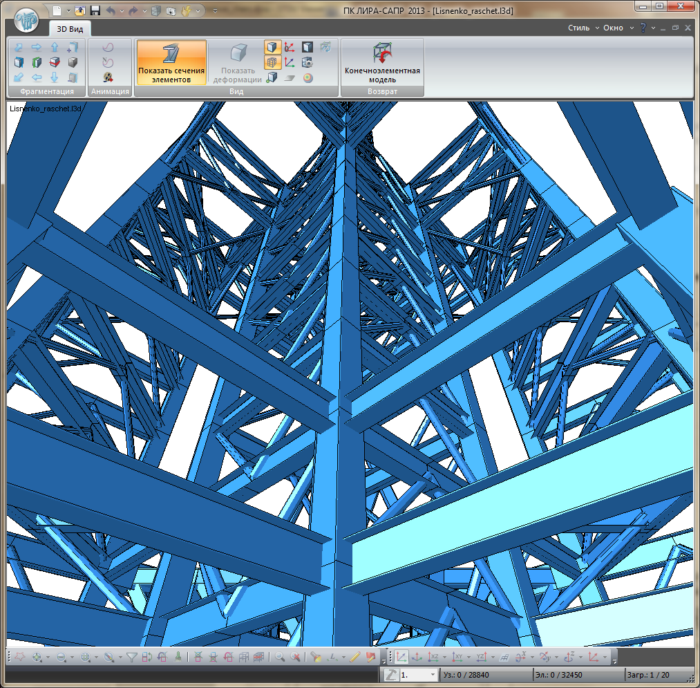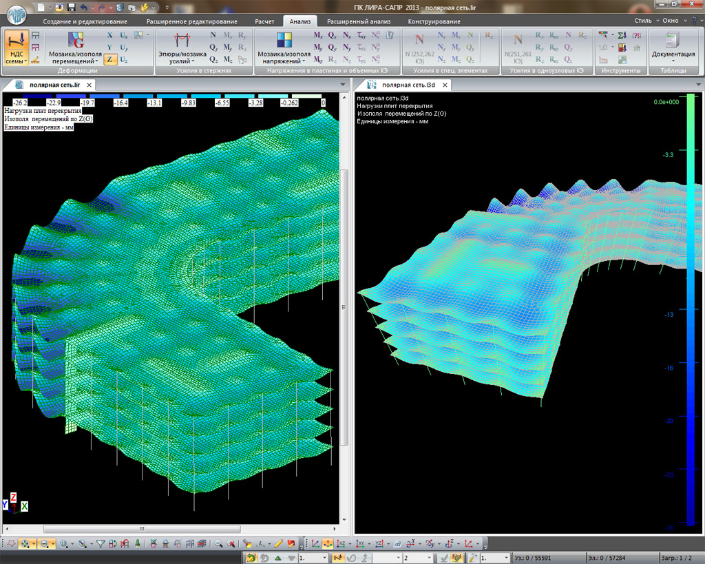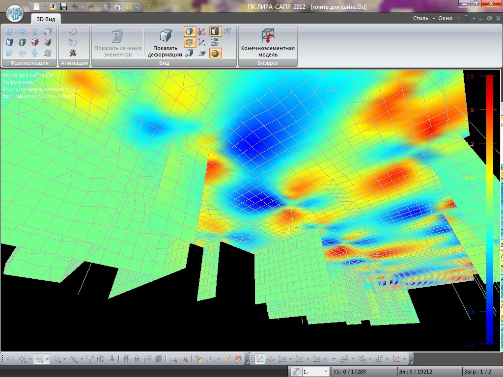 пользователя с возможностью 3D-визуализации расчетной схемы на всех этапах синтеза и анализа. Мощная система диагностики. Многочисленные виды представления результатов решения задачи - в графическом (изополя, эпюры, деформированные схемы, анимация форм колебаний) и табличном (перемещения, напряжения, усилия, РСУ, РСН, результаты подбора арматуры в железобетонных элементах и сечений стальных элементов) позволяет быстро провести необходимый анализ. Режим вариантного проектирования - в одной задаче пользователь может варьировать сечениями элементов, материалами, нормативами.Интерфейс пользователя нового поколения
