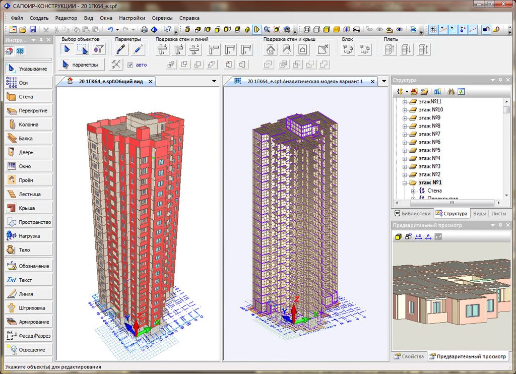Синтез расчетной схемы здания или сооружения на основе управляемой процедуры преобразования 3D и 2D архитектурных моделей, созданных в различных графических программах: САПФИР-3D, Allplan, Revit, AutoCAD и др.Мощный многофункциональный процессор