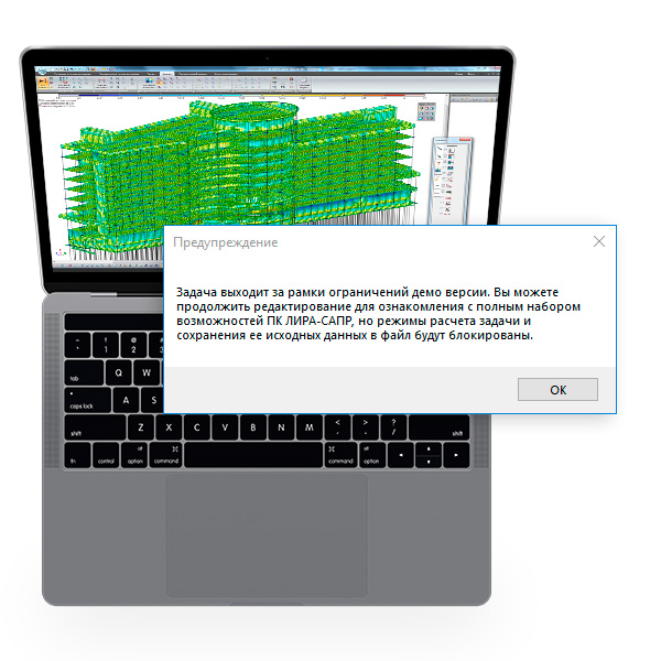 Демонстрационная версия предоставляет доступ ко всем элементам пользовательского интерфейса, знакомит со всеми новыми режимами работы программы, позволяет создавать без существенных ограничений расчетные схемы зданий, сооружений, конструкций различного назначения. При этом сохранение и расчет возможны только для тех задач, которые не выходят за рамки ограничений, установленных для демонстрационных проектов.