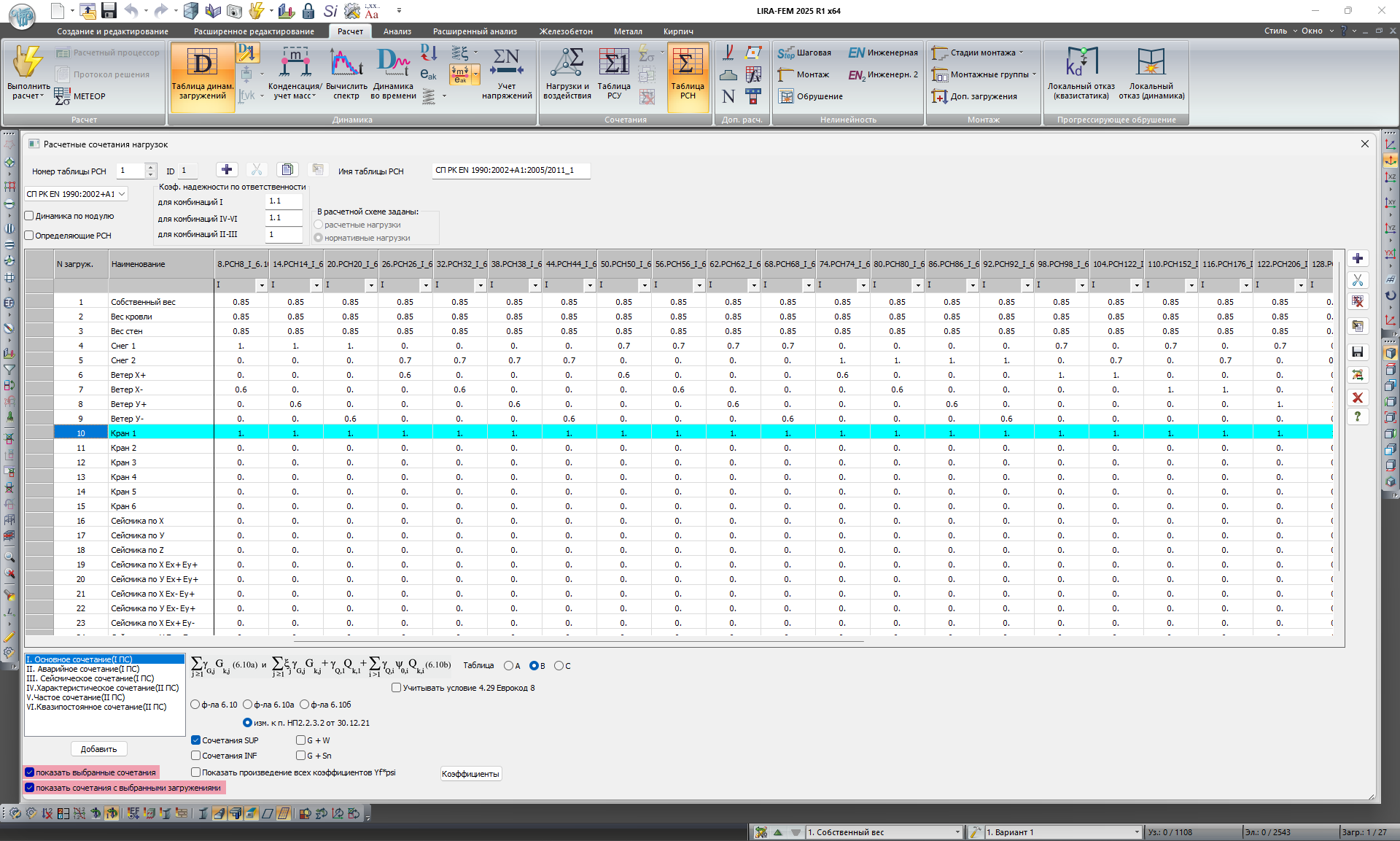 Для задания и контроля исходных данных в таблице РСН добавлены фильтры, которые позволяют быстро найти необходимые комбинации по типу и содержанию выбранных загружений.