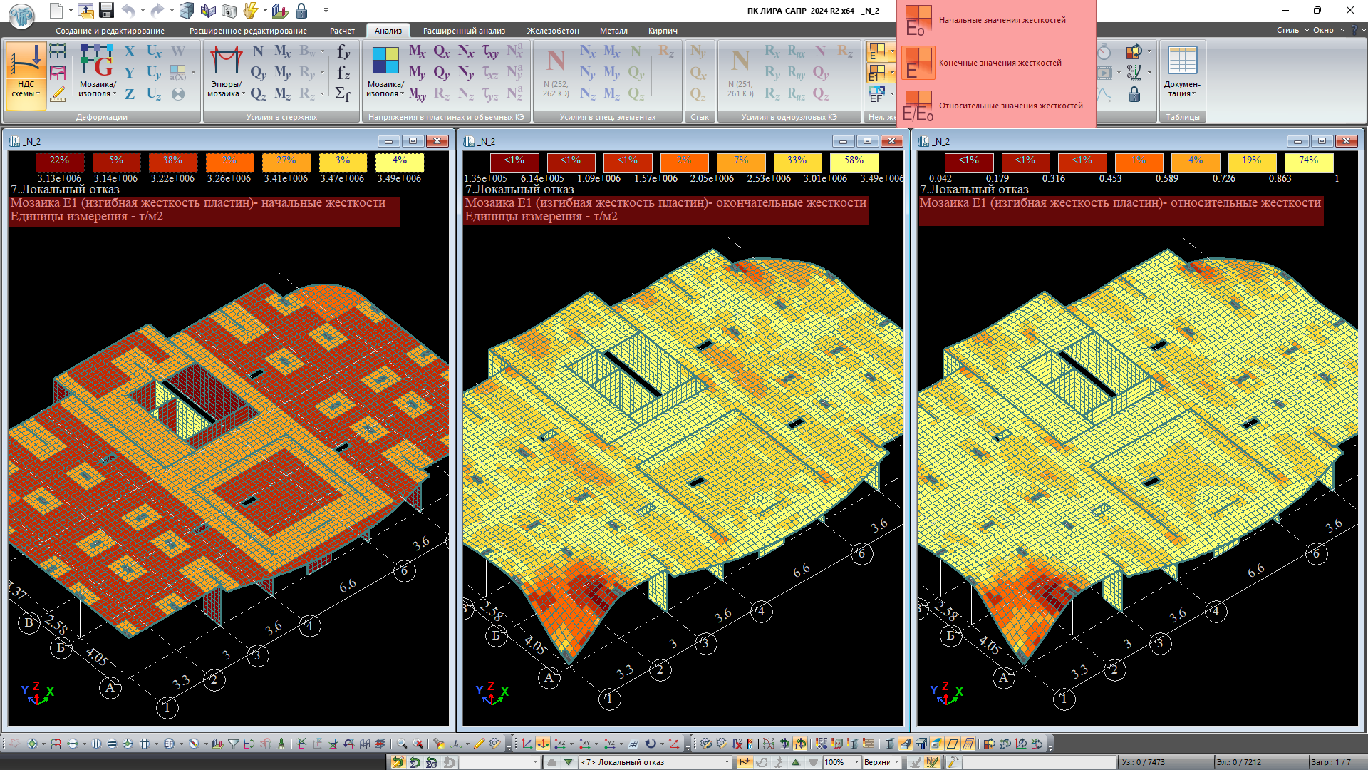 Добавлена опция выбора способа отображения мозаик представляющих начальные, конечные и относительные значения нелинейных жесткостей пластин и стержней вычисленных в результате расчета системы Инженерная нелинейность 1 (итерационный метод расчета на определяющее нагружение) и физически нелинейного расчета моделирующего процесс возведения (Монтаж, Инженерная нелинейность 2 (шаговый метод расчета на определяющее нагружение), Прогрессирующее обрушение). А для одноузловых и двухузловых конечных элементов моделирующих упругие связи с учетом предельного усилия (КЭ 251, 252, 255, 256, 261, 262, 265, 266) и нелинейные упругие связи (КЭ 295, 296) добавлены мозаики вычисленных окончательных жесткостей.
