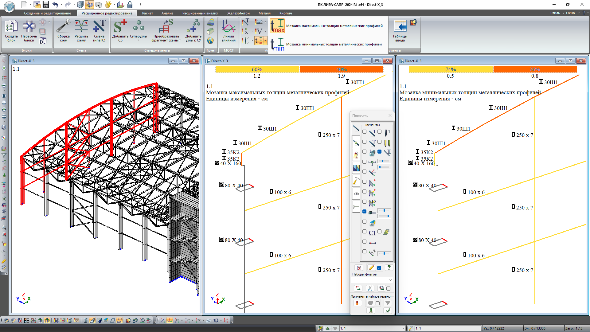 Реализован функционал для задания данных и определения нагрузки (узловые реакции) для нескольких групп узлов и элементов одновременно. Новый инструмент значительно упростит процесс анализа и документирования, позволяя, например, получать реакции на концах конструктивных элементов в местах их опирания на другие элементы, учитывая разные комбинации элементов с которых собирается нагрузка.