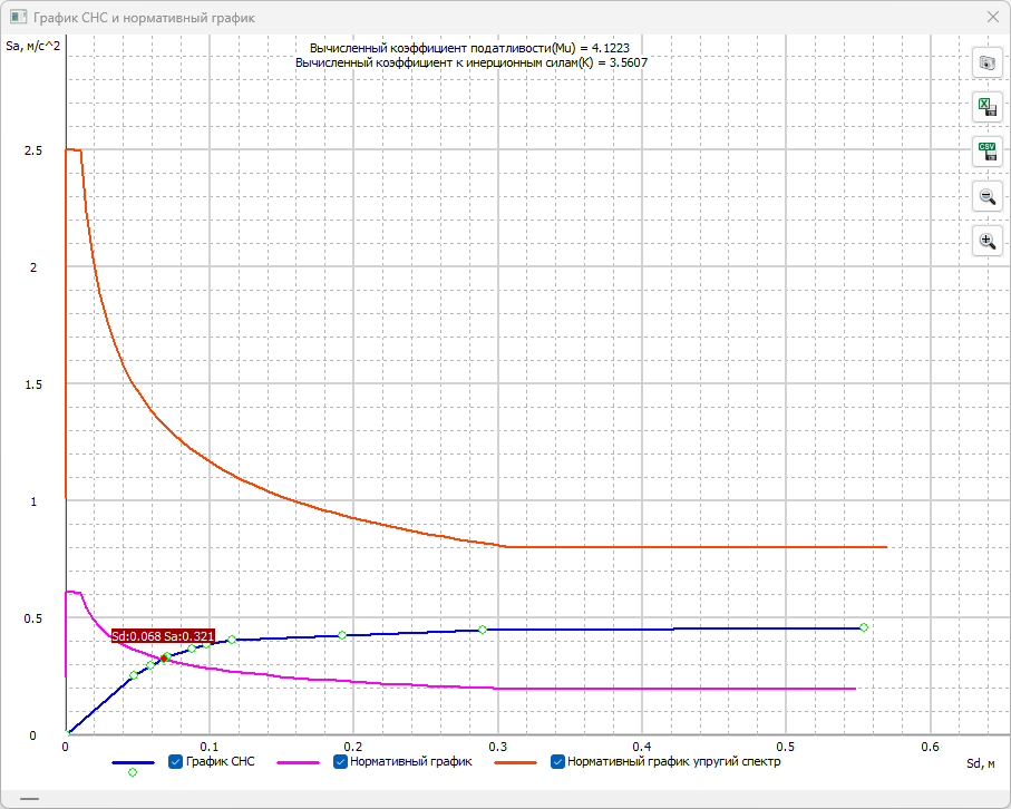 В окне просмотра расчета по методу Pushover Analysis (монотонное наращивание горизонтальной сейсмической нагрузки с контролем горизонтального перемещения) добавлена возможность построения нормативного графика упругий спектр.