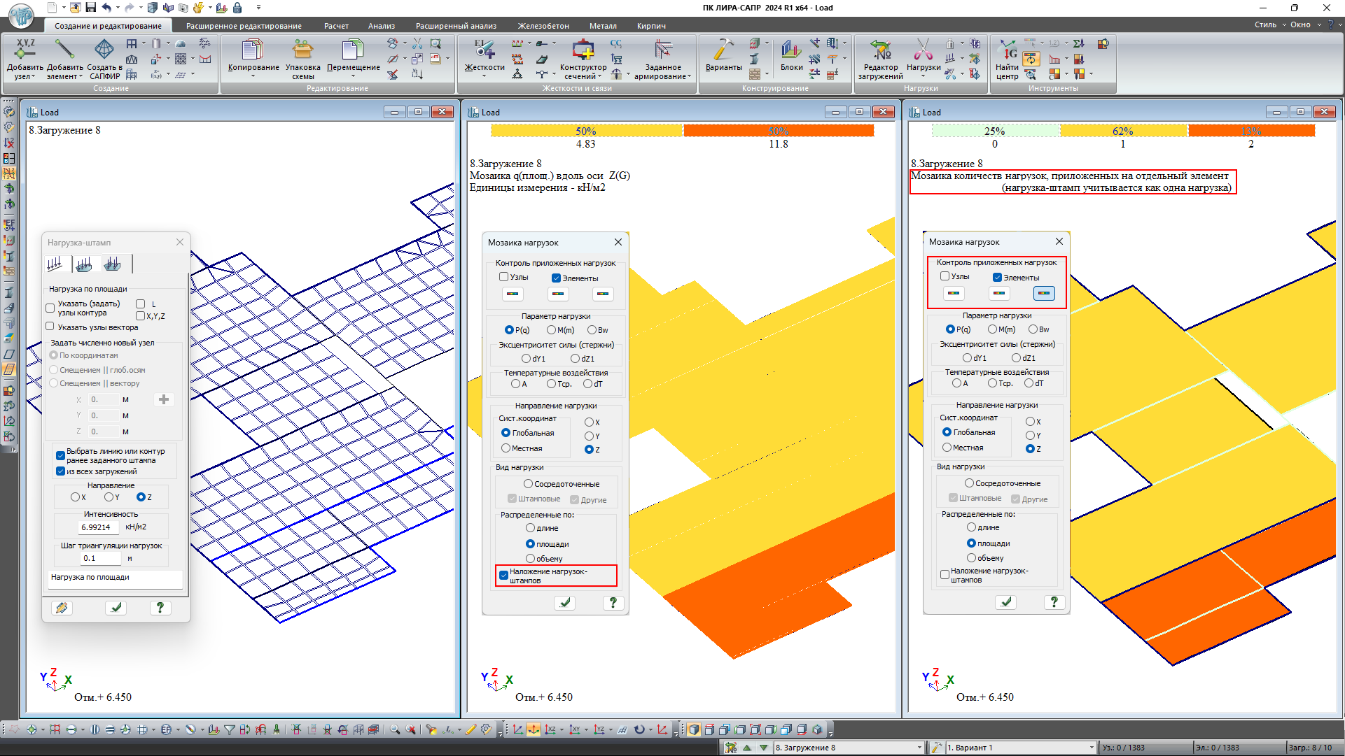 - Группа мозаик для контроля приложенных на схему нагрузок: мозаика количества одинаковых нагрузок, приложенных на отдельный узел и/или элемент; мозаика количеств нагрузок, приложенных на отдельный узел и/или элемент (нагрузка штамп учитывается как одна нагрузка); мозаика нагрузок с учетом наложения заданных нагрузок-штампов (равномерно-распределенных по площади) на пластины.