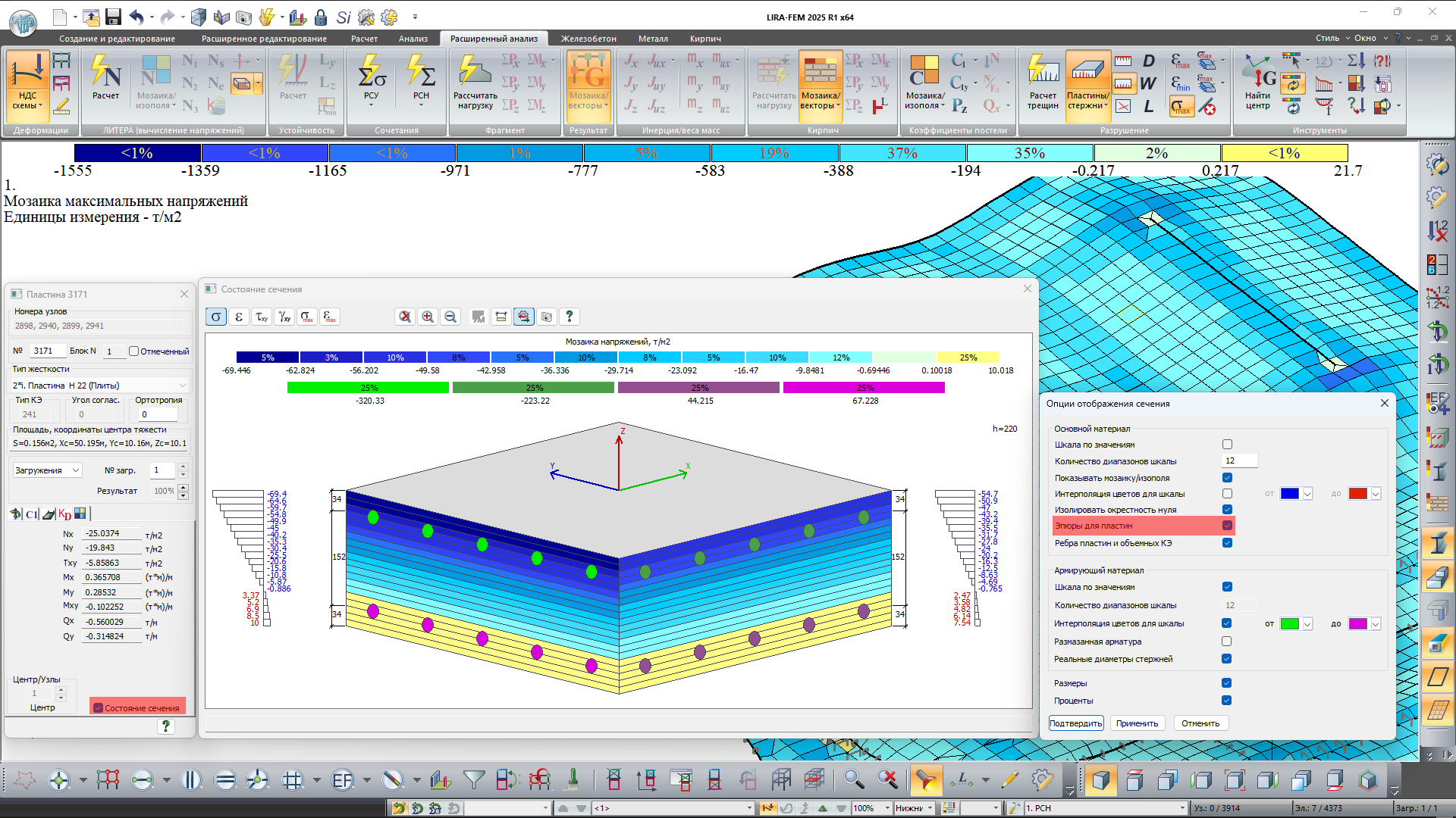 В окне просмотра и документирования состояния сечения для физически нелинейных итерационных пластин добавлена опция отображения эпюр напряжений и деформаций с подписью значений для каждой элементарной полосы сечения.