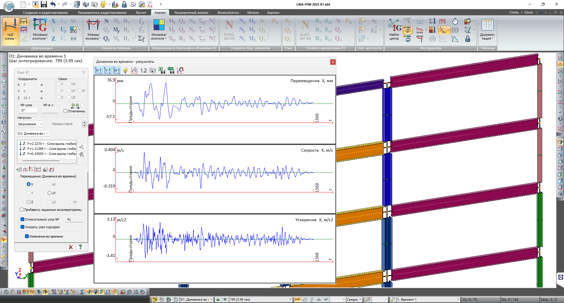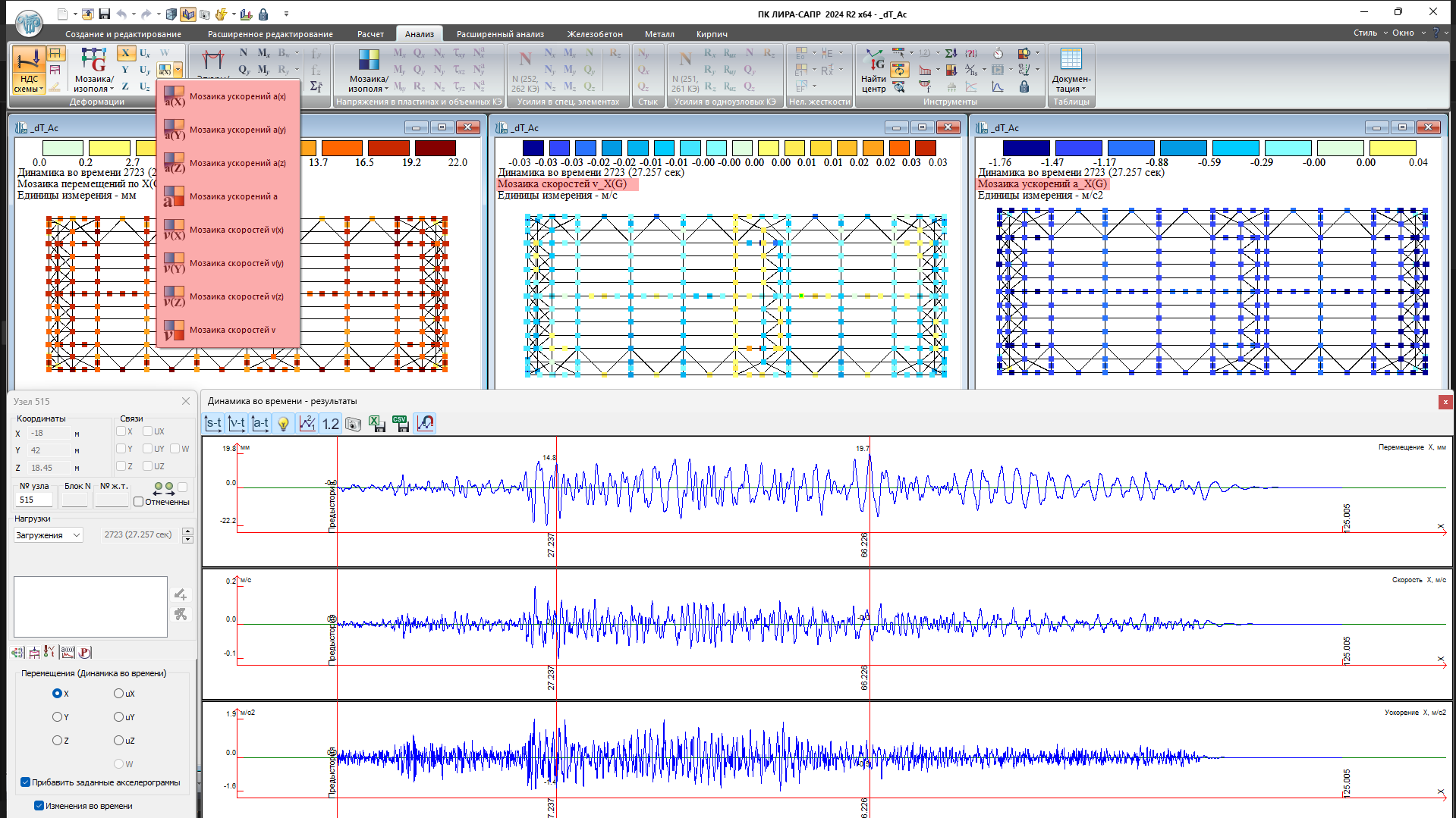 Для задач с расчетом на динамику во времени добавлена возможность отображения в глобальной или местной системе координат мозаик ускорений и скоростей для всех узлов схемы. Также доступен просмотр анимации изменения ускорений и скоростей во времени.