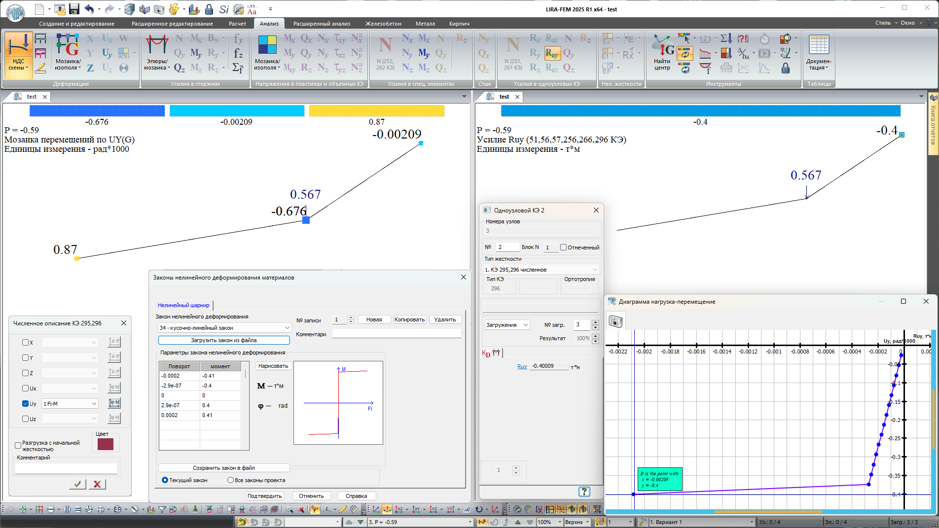 Для двухузловых и одноузловых КЭ нелинейных упругих связей с учетом разгрузки с начальной жесткостью (КЭ 295, 296) разработана опция построения графиков "деформации-усилия" на основе результатов расчета. Эти графики позволяют наглядно отобразить поведения нелинейных опор/нелинейных шарниров в соответствии с историей нагружения, что значительно улучшает понимание и анализ работы конструкции.