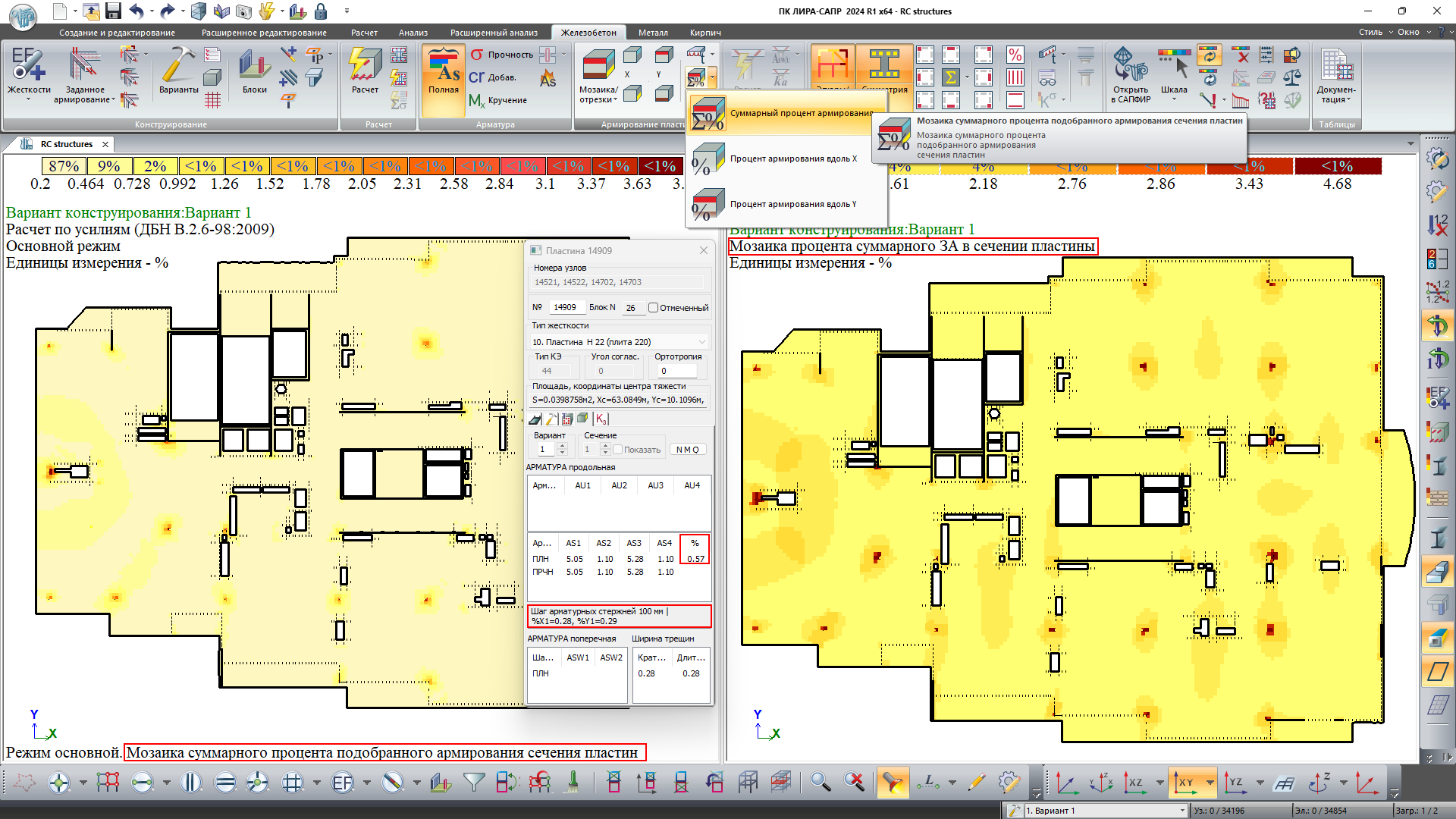 - Группа мозаик процентного отношения площади армирования подобранной/заданной продольной арматуры вдоль оси Х, Y и ХY (суммарной) к площади сечения пластины.
