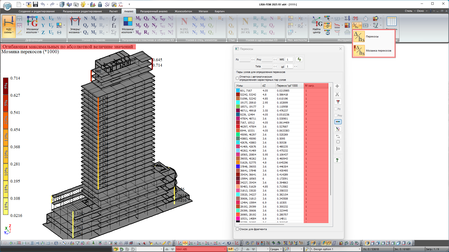 Для перекосов конструкции и эпюр перемещений (Fz, Fy) стержней добавлена возможность построения огибающих (по максимальным, минимальным и абсолютным значениям для загружений и РСН).