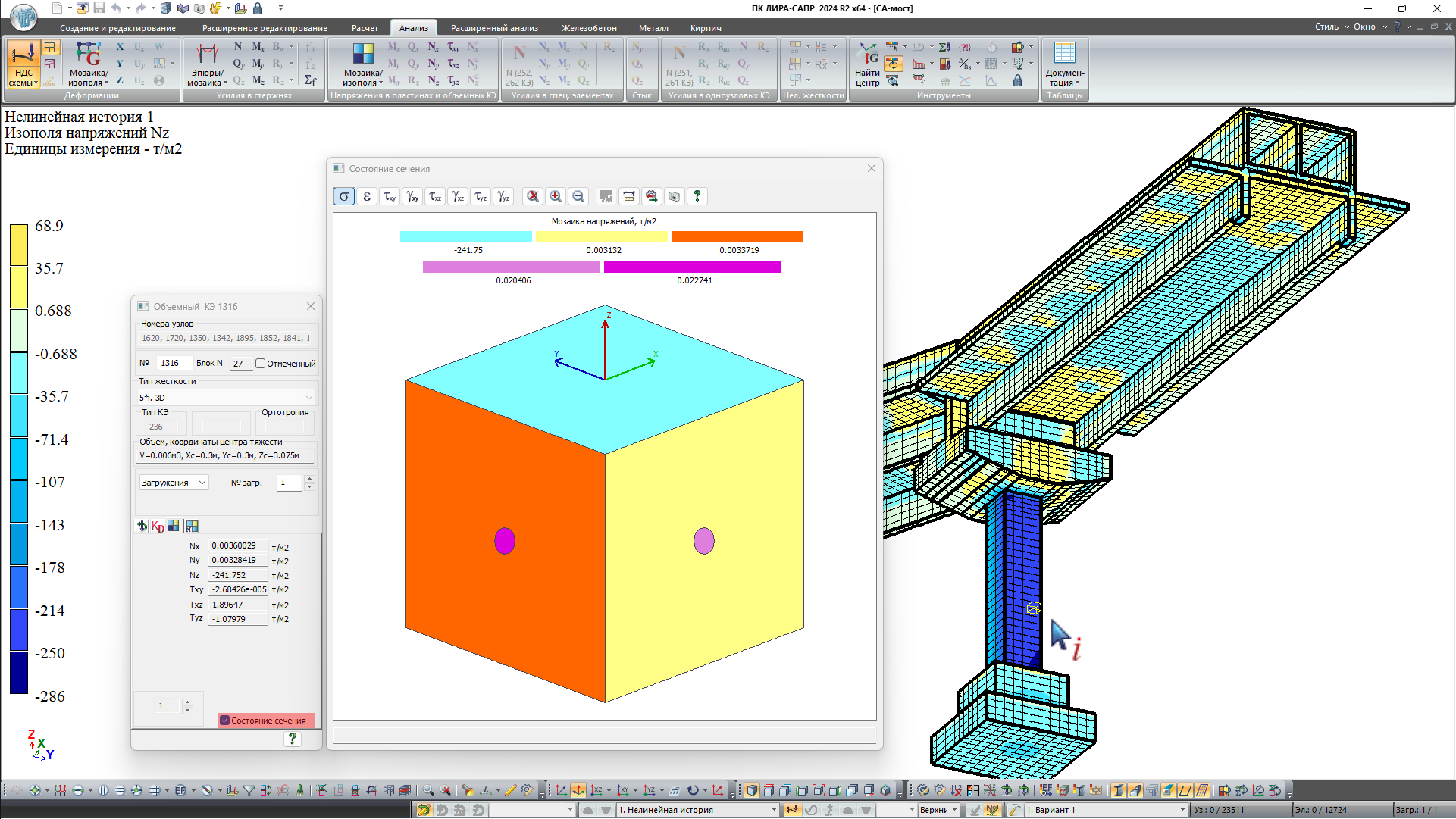 Для физически нелинейных задач с использованием объемных итерационных элементов реализован инструмент для просмотра, исследования и документирования вычисленных параметров напряженно-деформированного состояния. В окне Состояние сечения представлены следующие результаты расчета для выбранного итерационного объемного элемента в режиме получения информации: