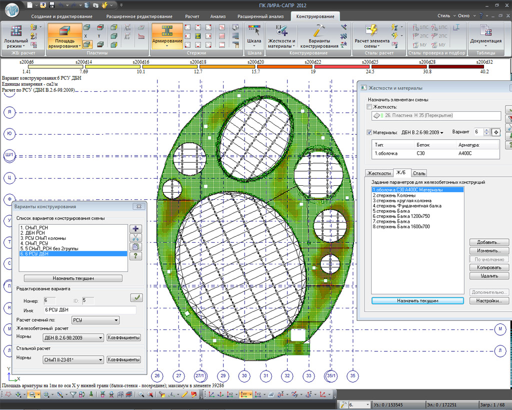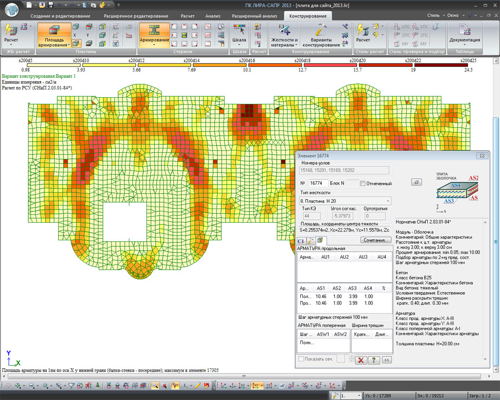 В режиме конструирования железобетонных конструкций реализован подбор площадей сечения арматуры колонн, балок, плит, диафрагм и оболочек по первому и второму предельным состояниям в соответствии с действующими в мире нормативами. По результатам расчета формируются чертежи балок и колонн, а также создаются dxf файлы чертежей.