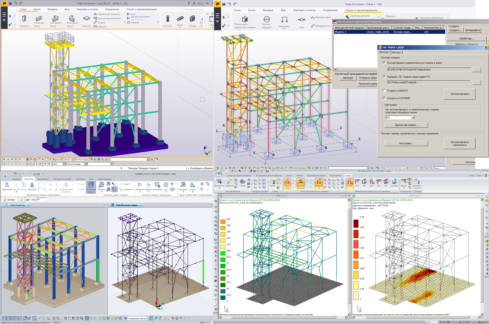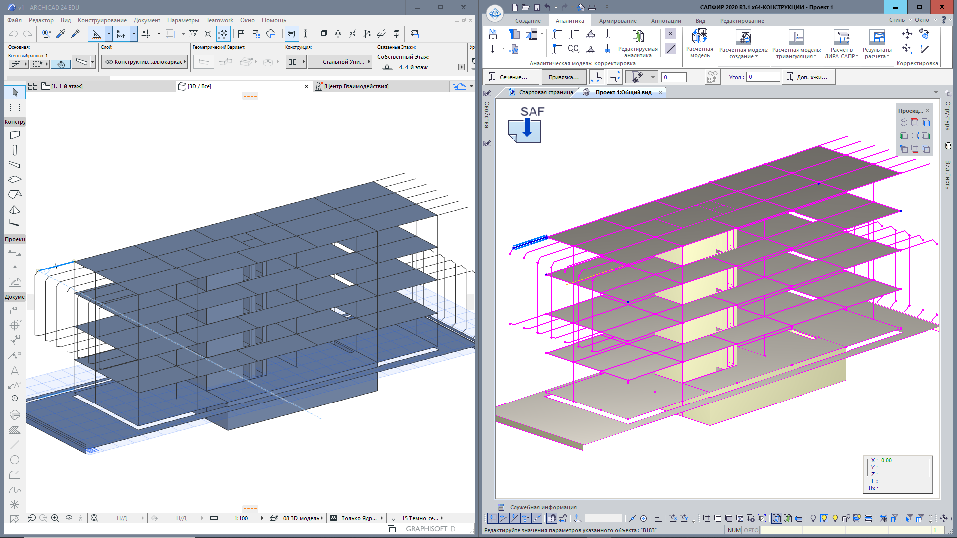 Связь с аналитической моделью ArchiCad и Allplan через SAF (Structural Analysis Format). Обмен данными осуществляется посредством *.xlsx файла, который можно открыть с помощью Microsoft Excel, проанализировать и/или отредактировать. Посредством SAF можно передать геометрию схемы, сечения, SAF материалы. Можно настроить сопоставление сечений и материалов с помощью SAF транслятора.