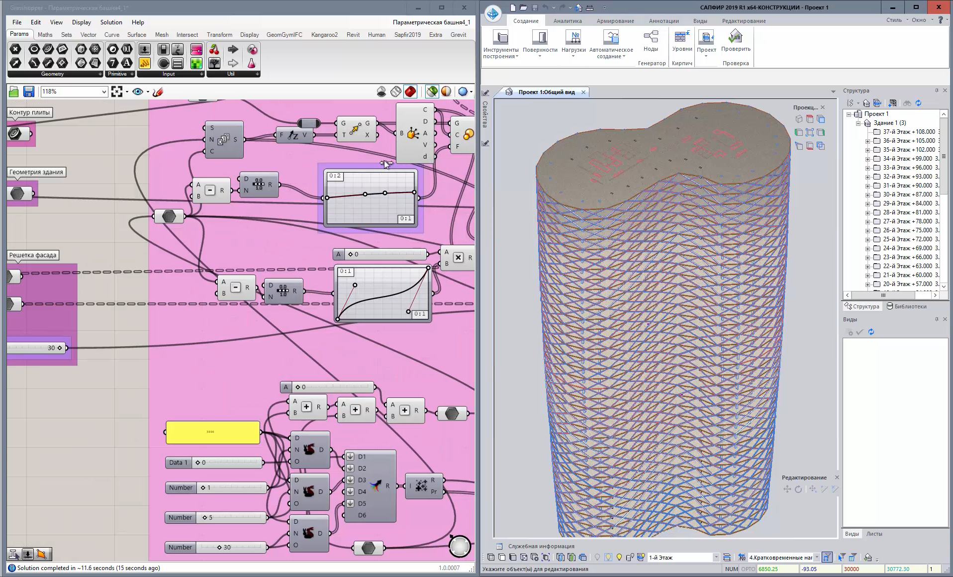 Плагин позволяет Rhino / Grasshopper и САПФИР напрямую взаимодействовать для создания и управления моделью BIM через интерфейс визуального программирования Grasshopper. Ассоциативный характер связи позволяет создавать рабочие проекты различной сложности. Меняя алгоритм в Grasshopper динамически меняется модель в САПФИР, а соответственно вместе с ней и расчетная схема.