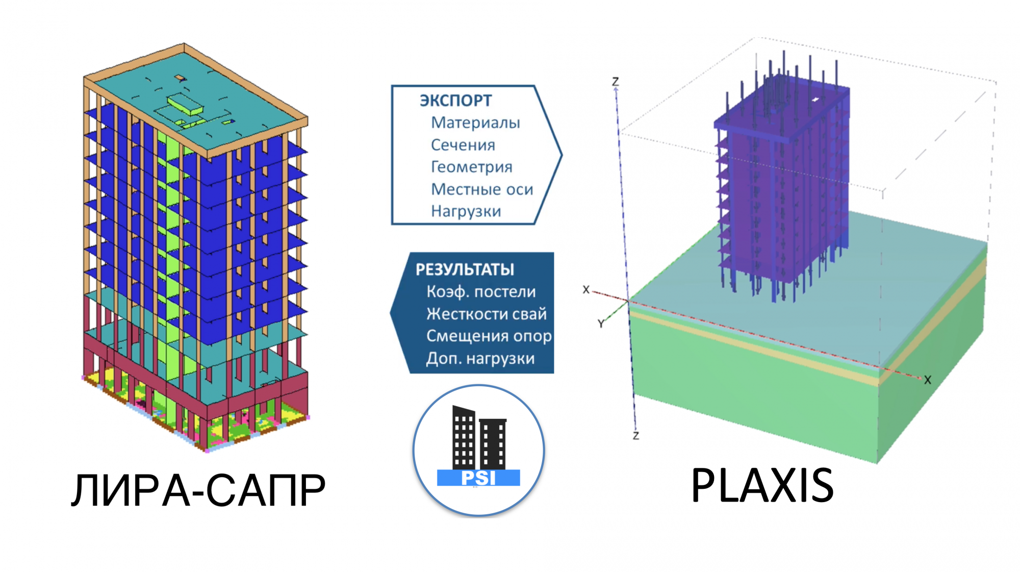 Взаимодействия с Plaxis через IFC и DXF файл; Взаимодействие ЛИРА-САПР с Plaxis через PSI (Plaxis Structure Interaction); Формирование расчетной модели из IFC файла; Передача модели в ВИЗОР-САПР и расчет; Создание модели грунта в Plaxis; Работа с PSI; Результаты в программе Output; Импорт файла из Output в ВИЗОР-САПР; Сравнение С1, С2 и передача из файла в файл; Примеры реальных объектов