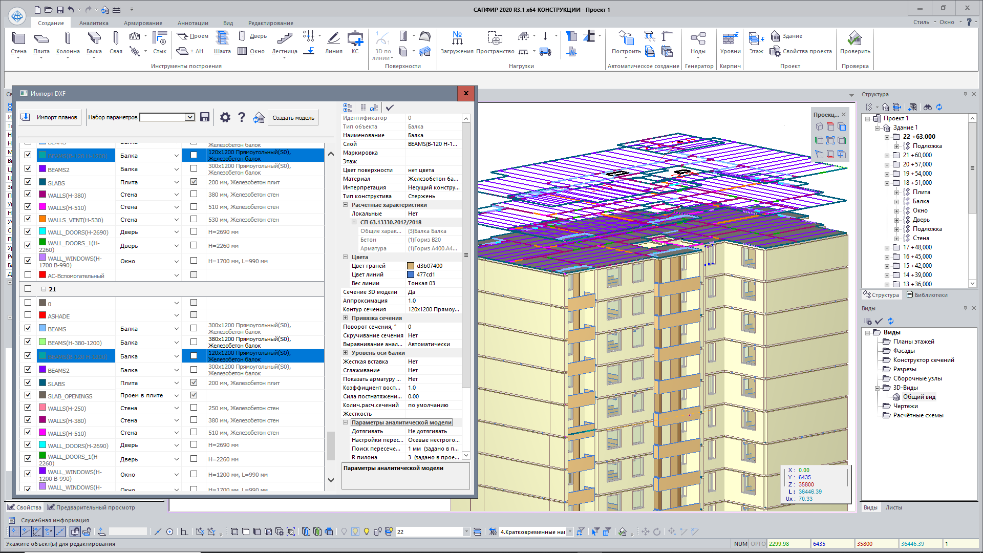 Импорт одного или нескольких IFC файлов в один проект. Импорт файлов в формате IFC2х3 и IFC4. Возможность выполнить преобразование одних типов объектов в другие, заменить материалы IFC на материалы САПФИР с уже предназначенными расчетными характеристиками для подбора армирования.