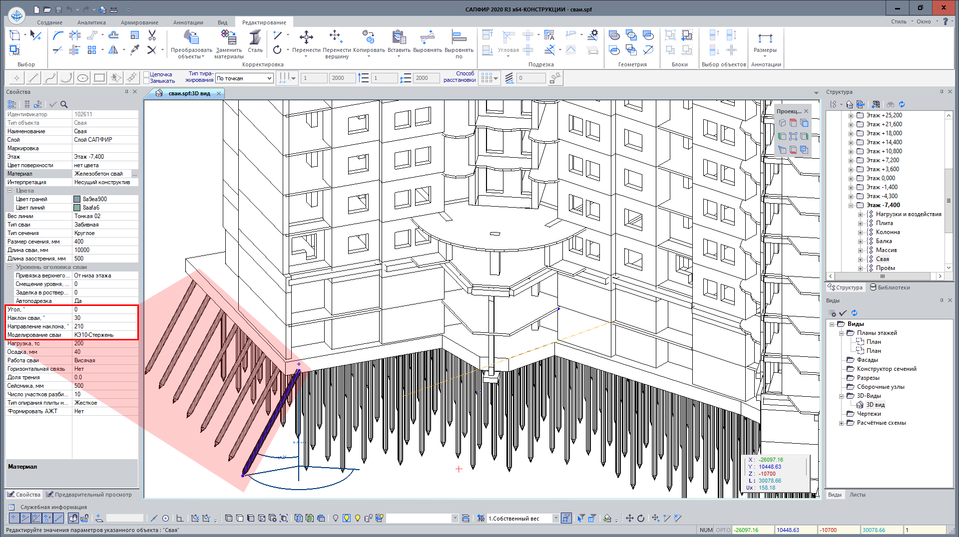 Для фундаментной плиты можно задать коэффициенты постели С1 и С2 или учесть в расчете модель грунта, подключив ее к модели здания. Кроме этого, можно использовать свайное основание, несущую способность которого можно задать или в виде нагрузки и осадки или определить жесткость сваи по модели грунта. Для фундаментной плиты также можно вычислить податливость в горизонтальном направлении.