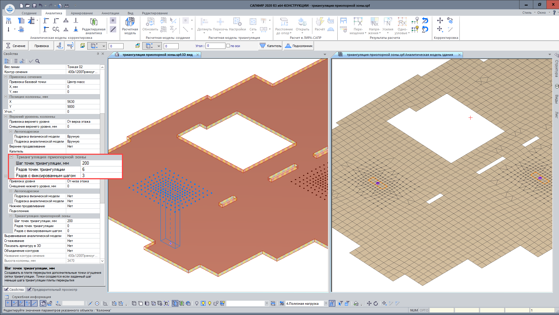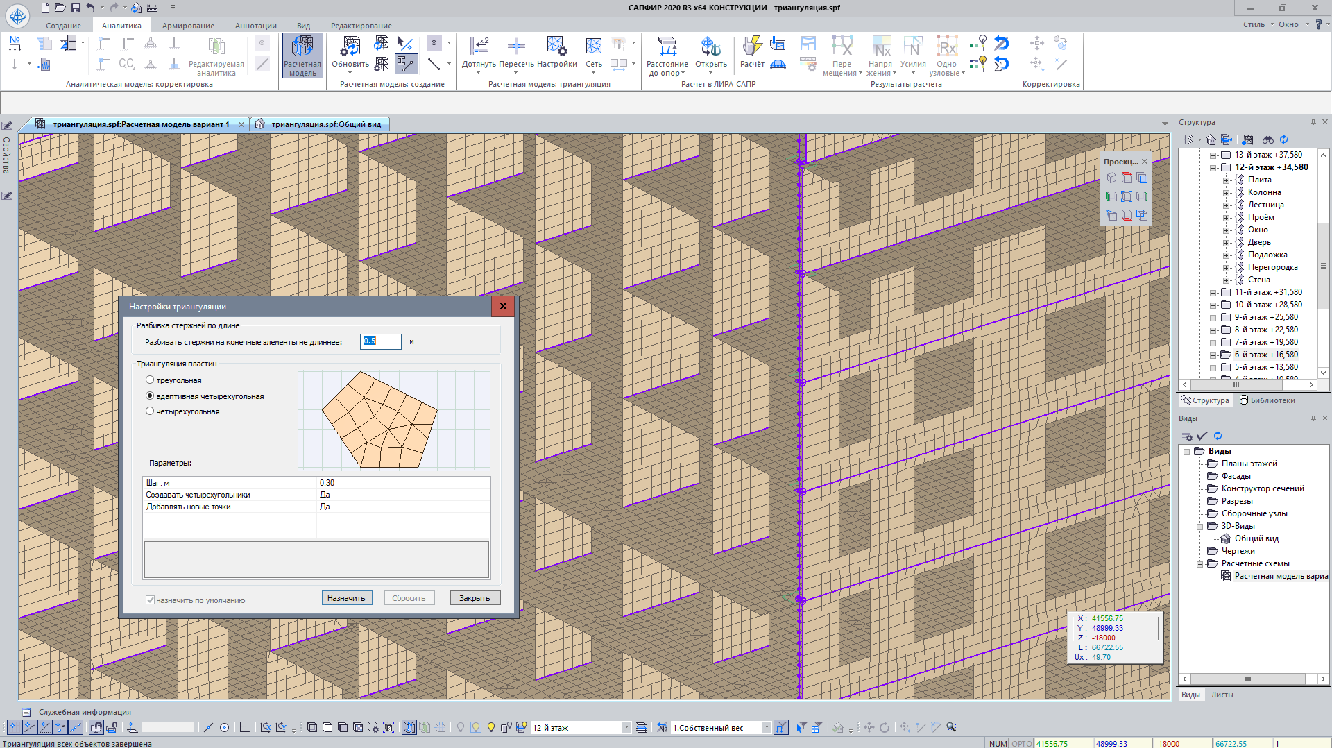 Новая настройка пересечений элементов расчетной модели в САПФИР 2020. Ускорение триангуляции. Задание линий триангуляции. Сохранение шаблона триангуляции для ипользования в других проектах. Вертикальные и горизонтальные линии триангуляции для стен. Сгущение шага триангуляции для зон над опорами.