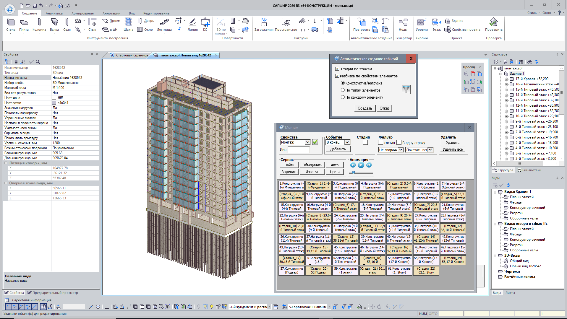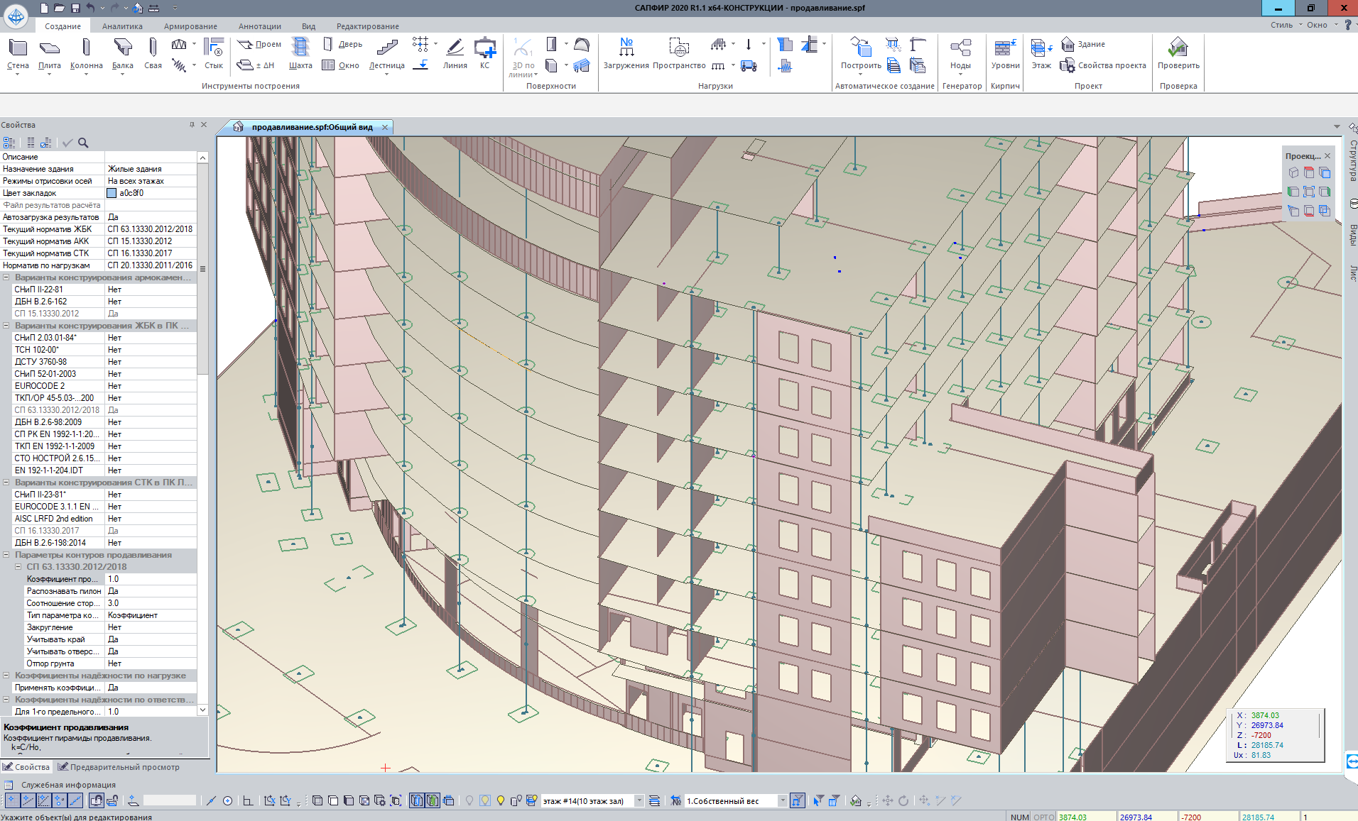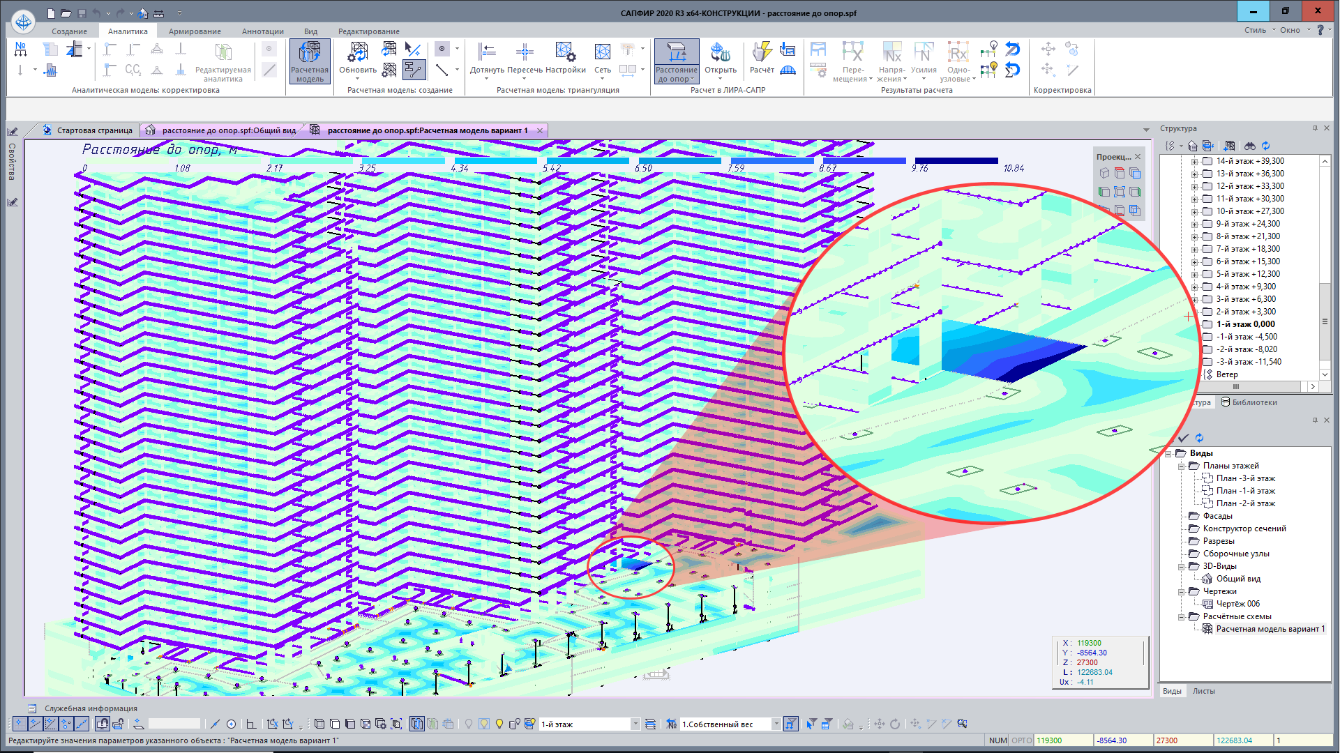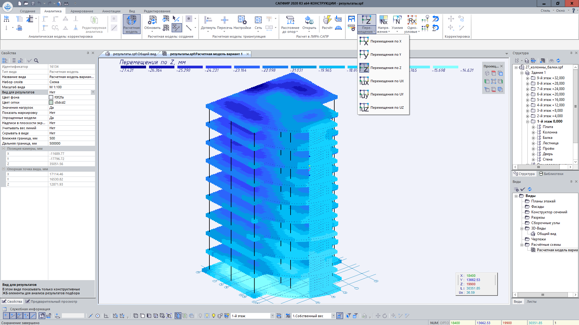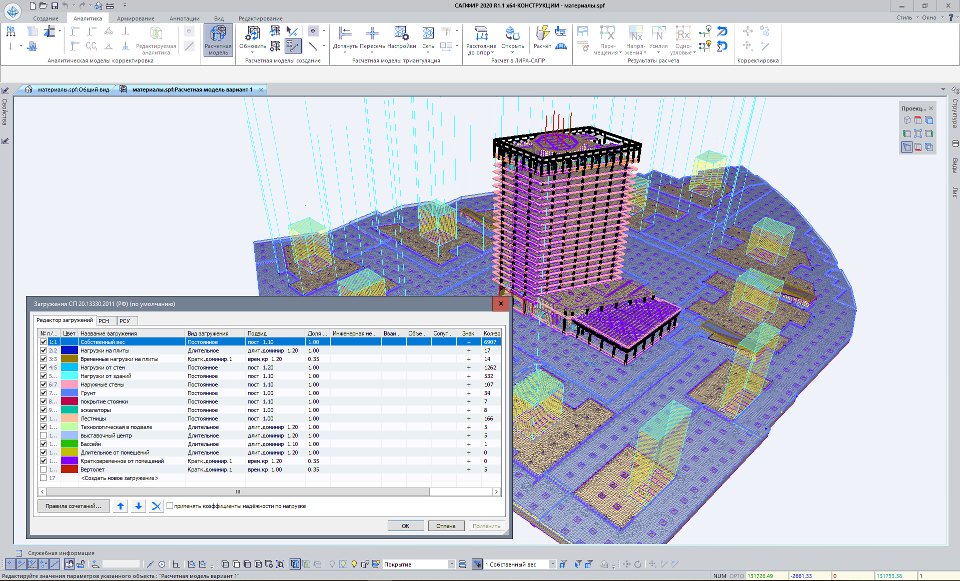 Новые инструменты предварительного анализа результатов в САПФИР 2020. Коэффициенты надежности по ответственности. Команды для анализа корректности расчетной схемы: раздвинуть этажи и расстояние до опор. Расчет из САПФИР и анализ перемещений, напряжений, усилий в элементах по загружениям и по РСН. Генерация РСН по EUROCODE EN 1991-1-4:2005.