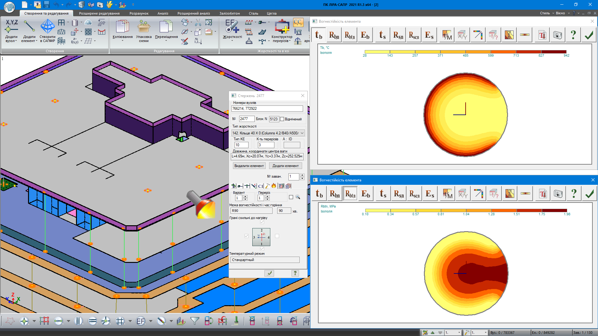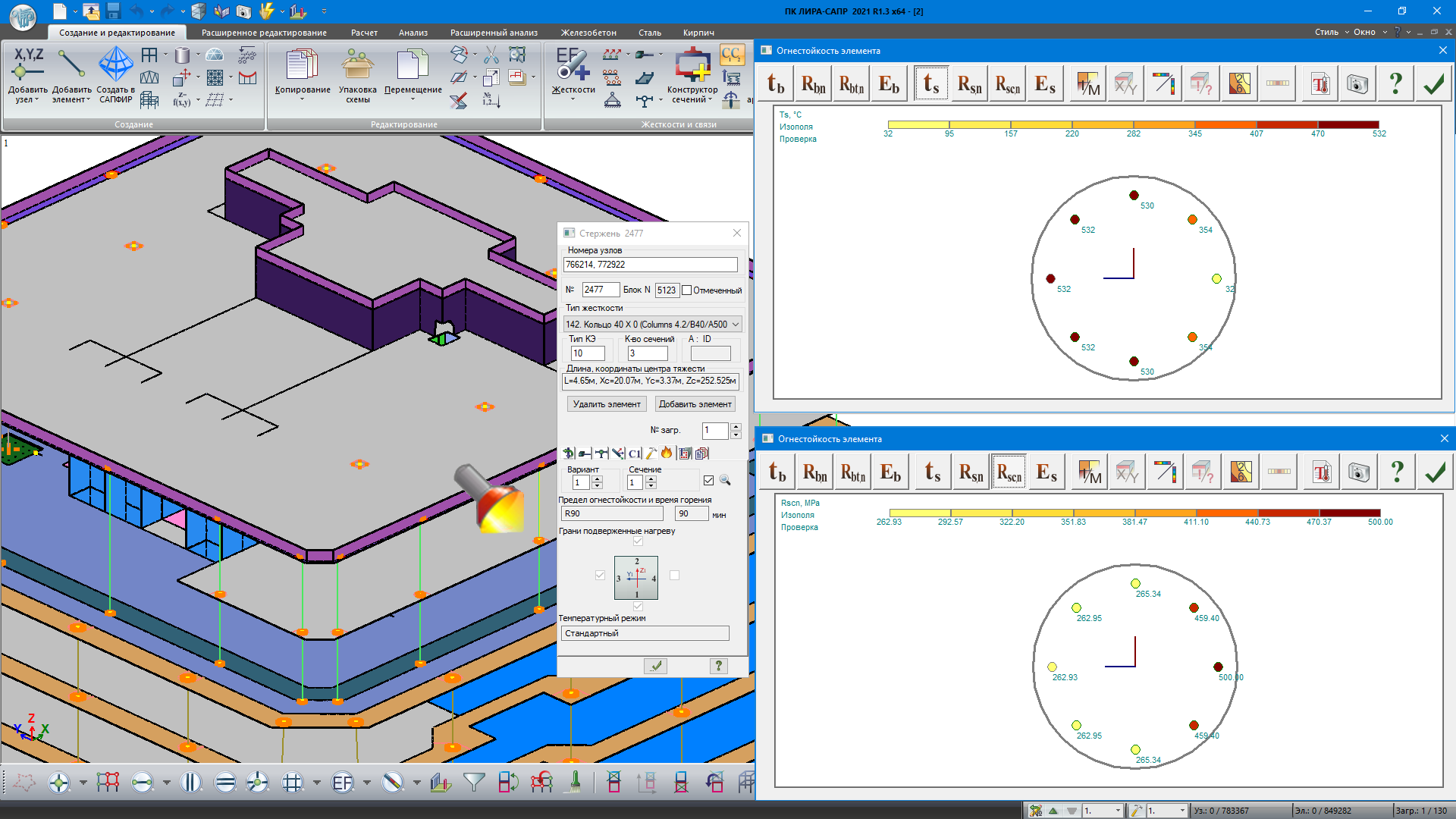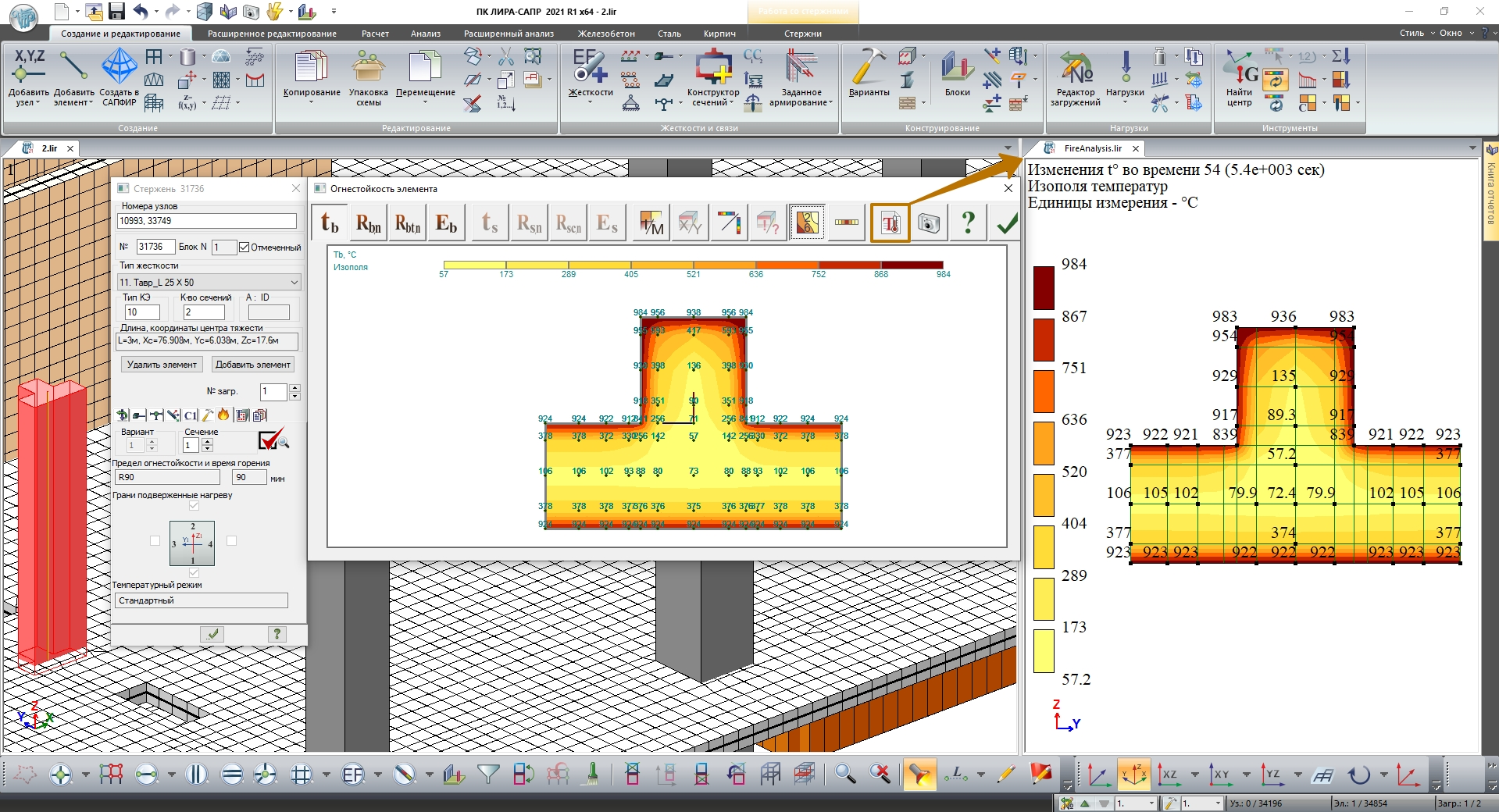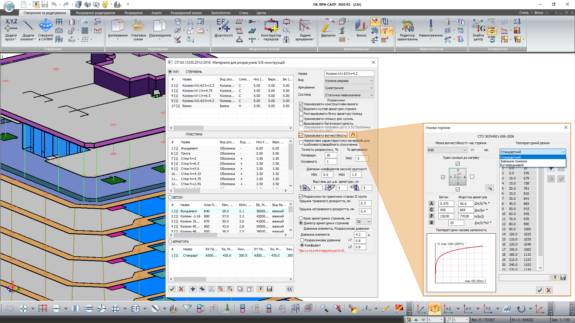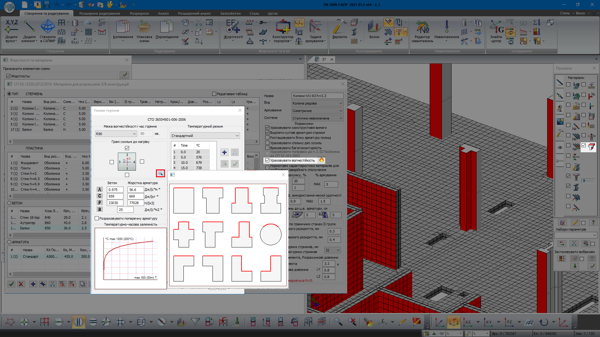 Расчет предела огнестойкости железобетонных и сталежелезобетонных конструкции в ПК ”ЛИРА-САПР” сводится к вычислению распределения температур по сечению, в соответствии с заданным периодом времени в условиях пожара; дальнейшей корректировкой физико-механических характеристик материалов на основании полученных температурных полей; проверке несущей способности элементов конструкции на действие нормативной нагрузки и в случае невыполнения требований – наращиванию армирования.