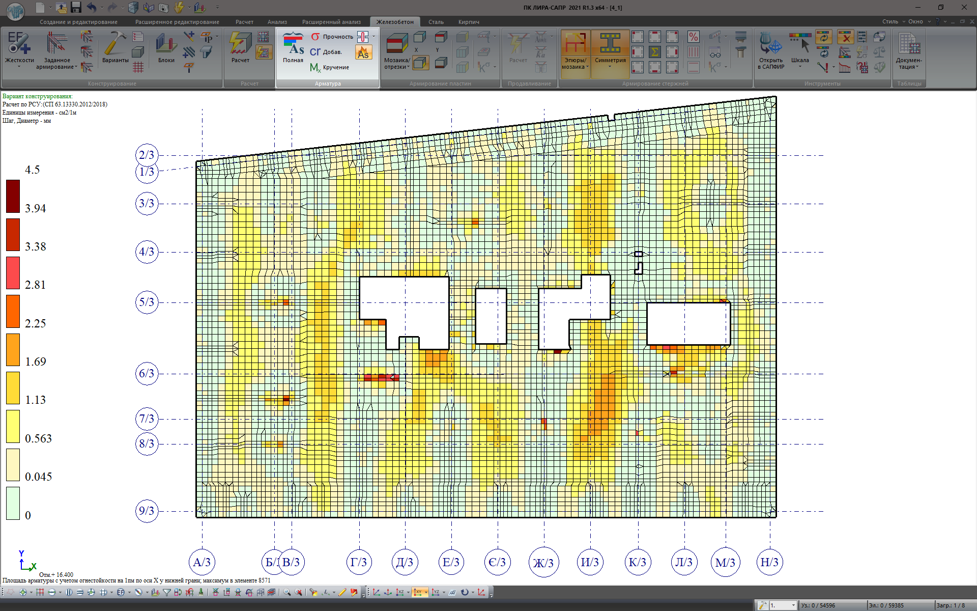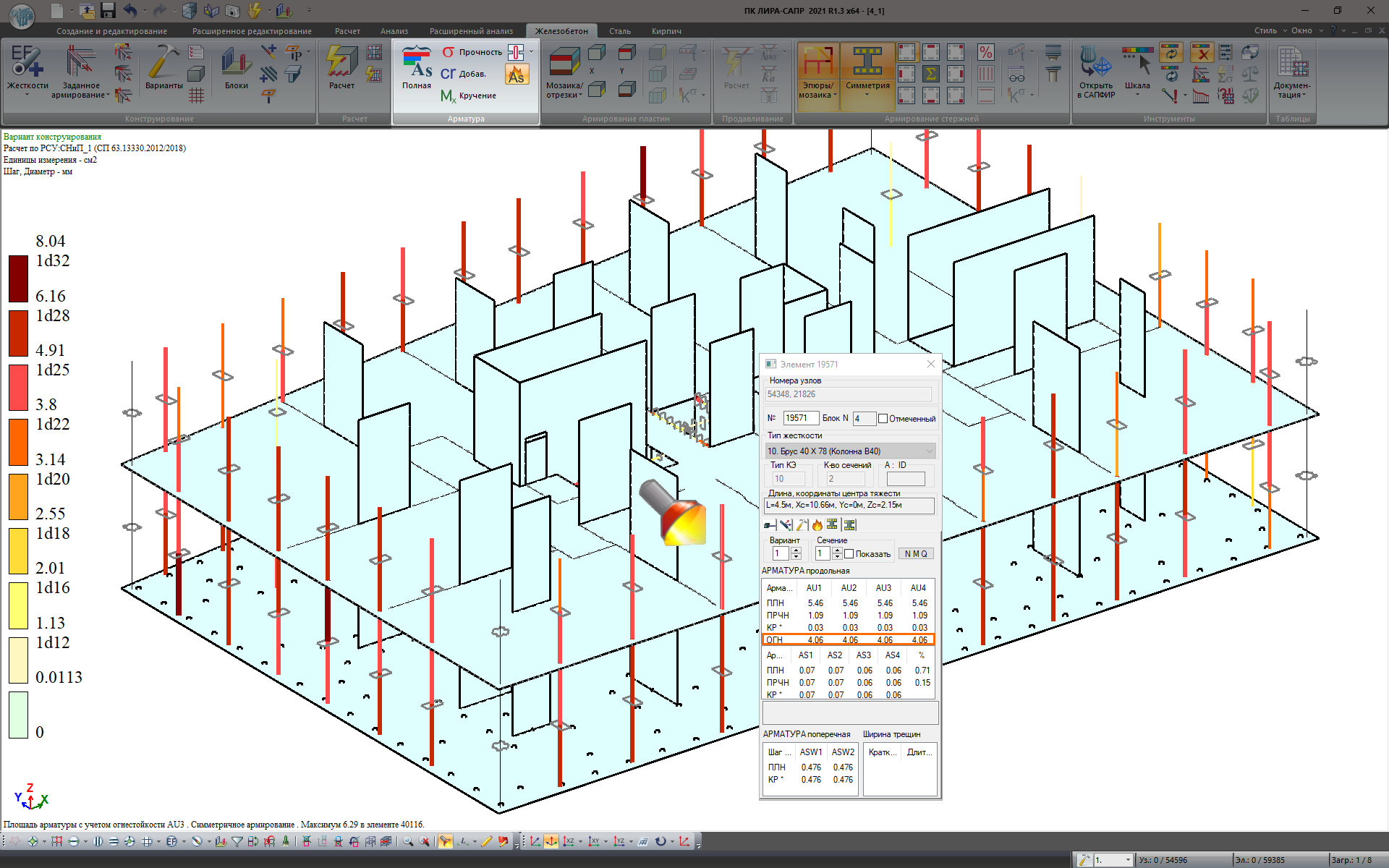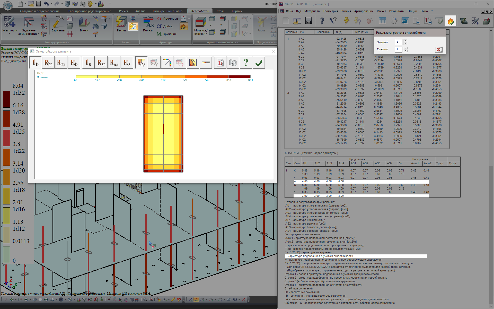 Результаты подобранной арматуры огнестойкости представлены в графическом виде – мозаики армирования для пластинчатых и стержневых элементов схемы. А также, подобранная от расчета на огнестойкость арматура представлена отдельной строкой в таблицах результатов и в диалоговом окне Информация об элементе.
