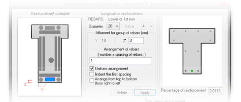 Расчетная схема элемента и действующие на него усилия могут импортироваться из системы АРМ-САПР или задаваться непосредственно пользователем. Производится подбор арматуры, а также проверка заданного армирования для выбранного элемента.