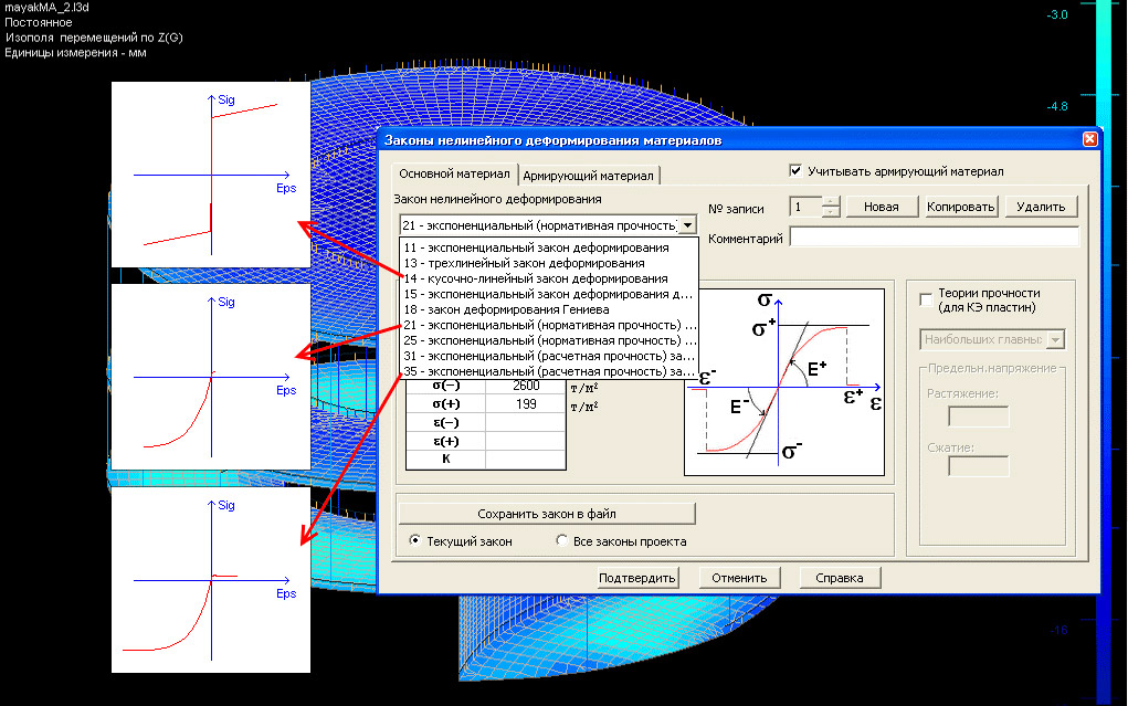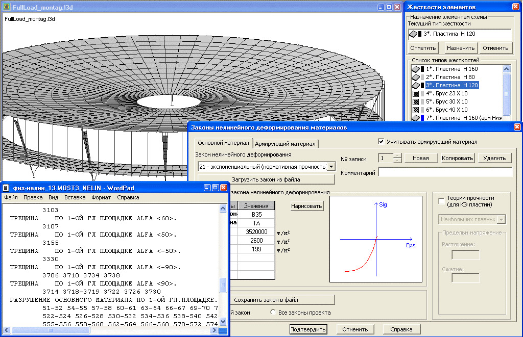 реализует расчет физически нелинейных стержневых систем, плит и оболочек, а также геометрически нелинейных систем, в том числе и изначально геометрически изменяемых (ванты, вантовые фермы, тенты, мембраны), при этом выбор шага связанный с нахождением равновесной формы производится автоматически. В остальных случаях величина шагов может назначаться пользователем. Для физически нелинейных систем зависимость между напряжениями и деформациями задается пользователем и может иметь различные законы (экспоненциальная, ломаная и др.). Допускается использование биматериала, например, бетон с включением арматурных стержней. На основе этого процессора можно организовать компьютерное моделирование процесса нагружения. Например, для железобетонной плиты можно проследить постадийное развитие трещин, пластических деформаций в сжатом бетоне и растянутой арматуре, получить напряженно-деформируемое состояние, предшествующее разрушению конструкции. Этот процессор дает также возможность рассчитать конструкцию с одновременным учетом физической и геометрической нелинейности.