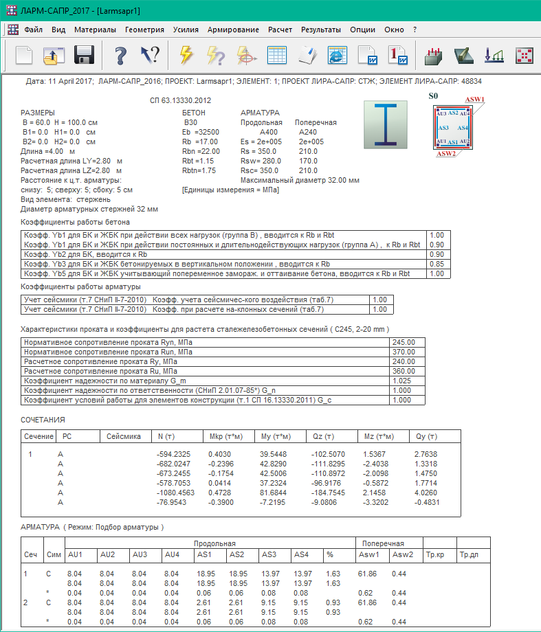 Реализована деформационная теория железобетона. Расчет сталежелезобетонного сечения выполняется на все виды усилий: Мх, Мy, Мkp, N, Qx, Qy.