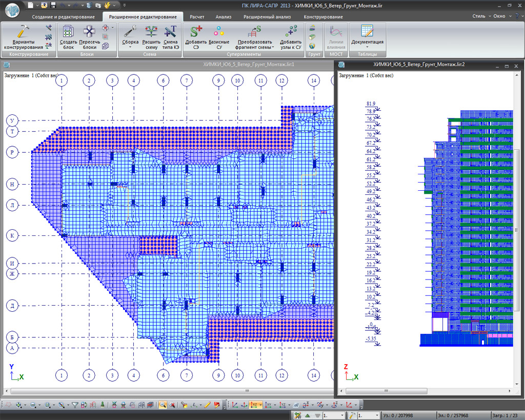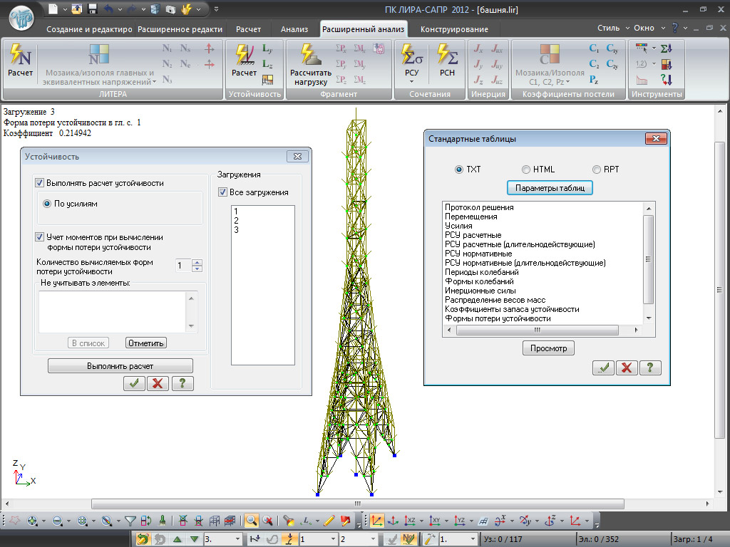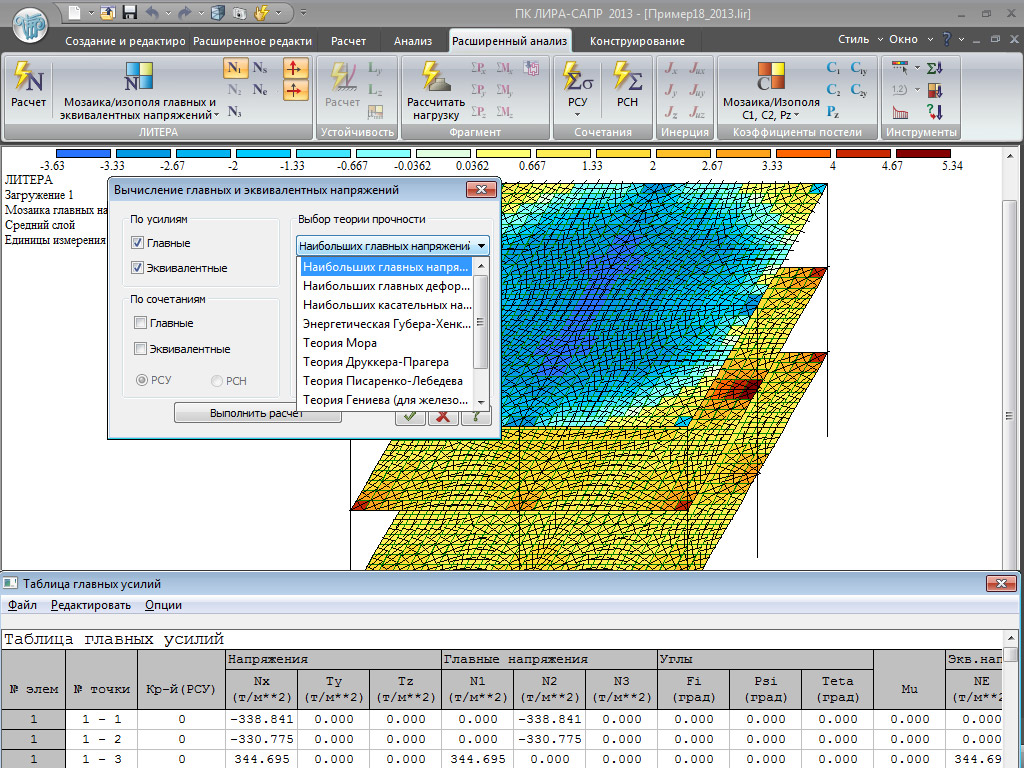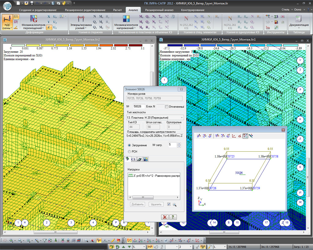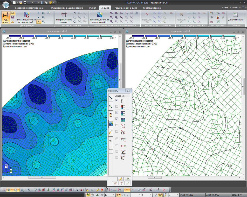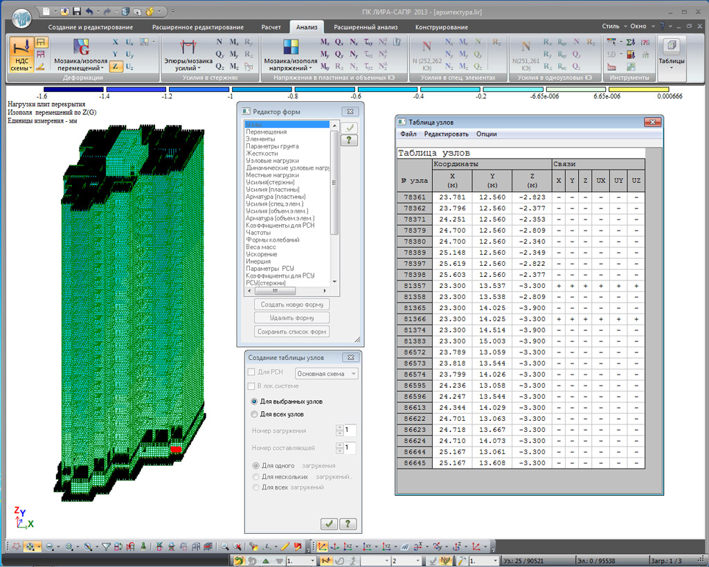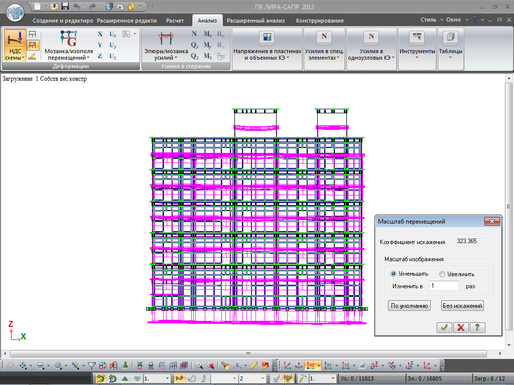 наличие многочисленных приемов анализа результатов (построение изополей, изолиний напряжений, перемещений, эпюр усилий, анимация колебаний, построение деформированных схем, цифровая и цветовая индикация элементов и их атрибутов, регулируемый масштаб изображения);
