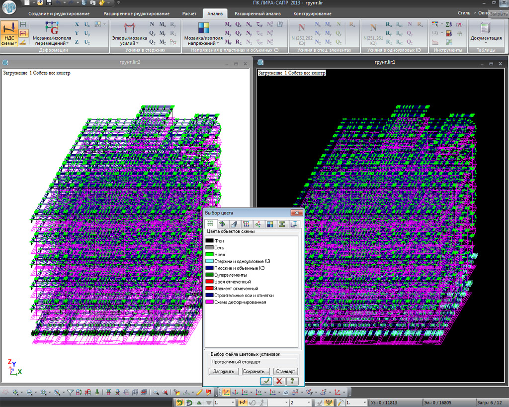 цветовая схема (цвет фона рабочего окна, цвета составных элементов и объектов расчетной схемы, палитра изополей результатов);
