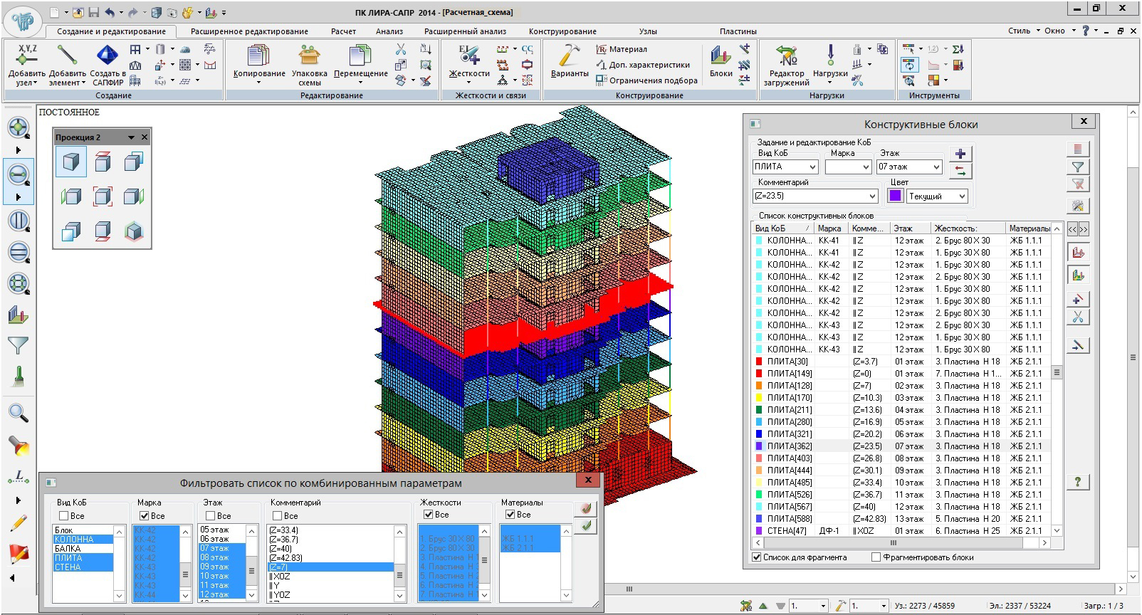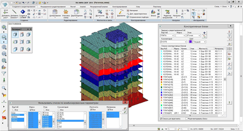 Введена возможность нового топологического структурирования расчетных схем с использованием конструктивных блоков. В качестве конструктивных блоков могут выступать произвольные фрагменты конструкции, назначенные пользователем (колонны, балки, стены, плиты, рамы, фермы, этажи и т.п.). Используя конструктивные блоки, теперь намного проще и быстрее находить, выделять и фрагментировать на расчетной схеме отдельные элементы зданий и сооружений, ориентируясь по присвоенным именам и маркам конструктивных блоков.