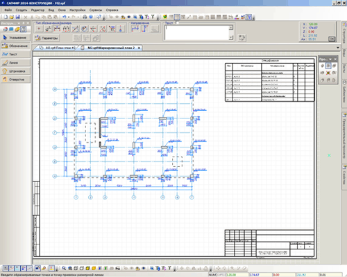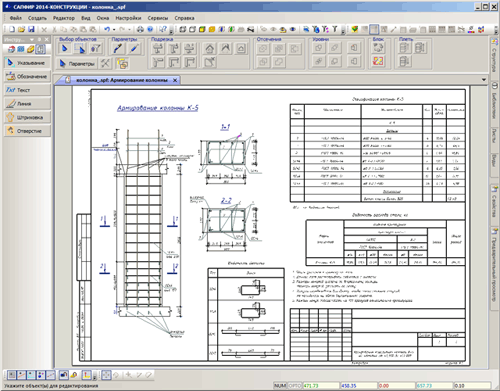 Для колонн создаются рабочие чертежи армирования со спецификацией, ведомостью деталей и ведомостью расхода стали. В автоматическом режиме выполняется образмеривание поперечных сечений колонн с учетом положения стержней рабочей арматуры. Имеется возможность получить маркировочный план вертикальных Ж/Б элементов с их спецификацией.