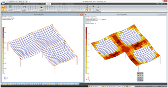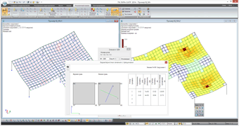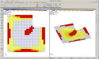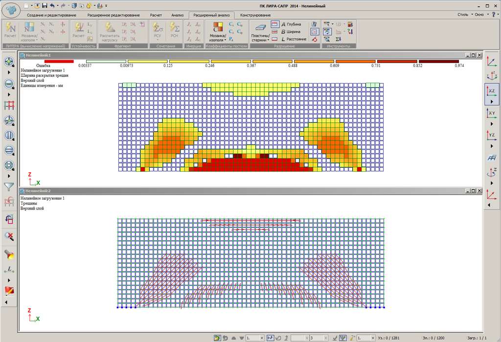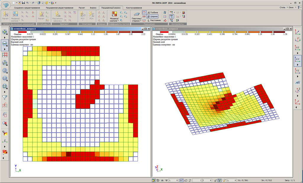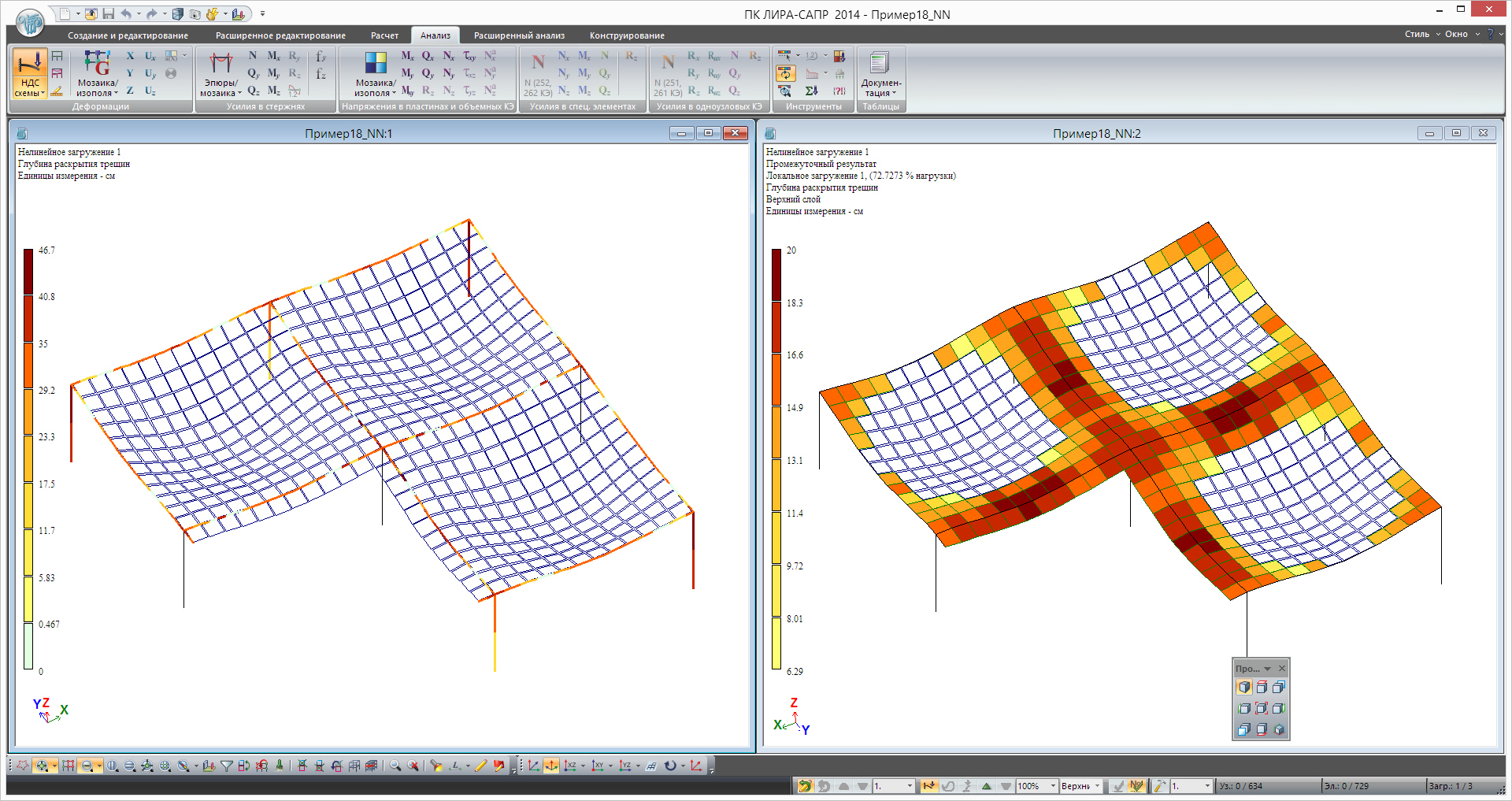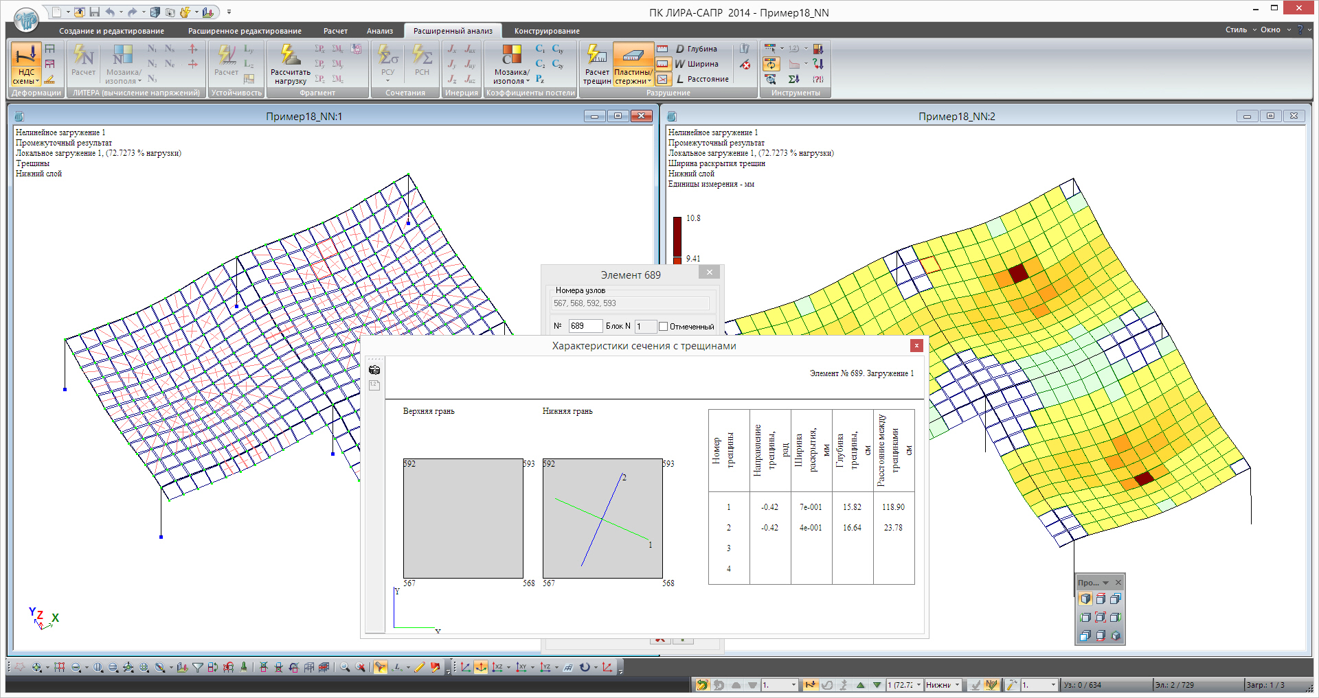 При обработке результатов нелинейного расчета расширен состав выводимых результатов. К традиционной информации о нелинейных перемещениях и усилиях добавились значения о ширине и глубине раскрытия трещин в стержневых и пластинчатых элементах, выводимые в виде цветовых мозаик и изополей непосредственно на расчетной схеме. Появилась возможность просматривать и документировать результаты не только на последнем шаге заданной нелинейной истории нагружения, но и в любом промежуточном шаге каждого из нагружений, входящих в нелинейную историю.