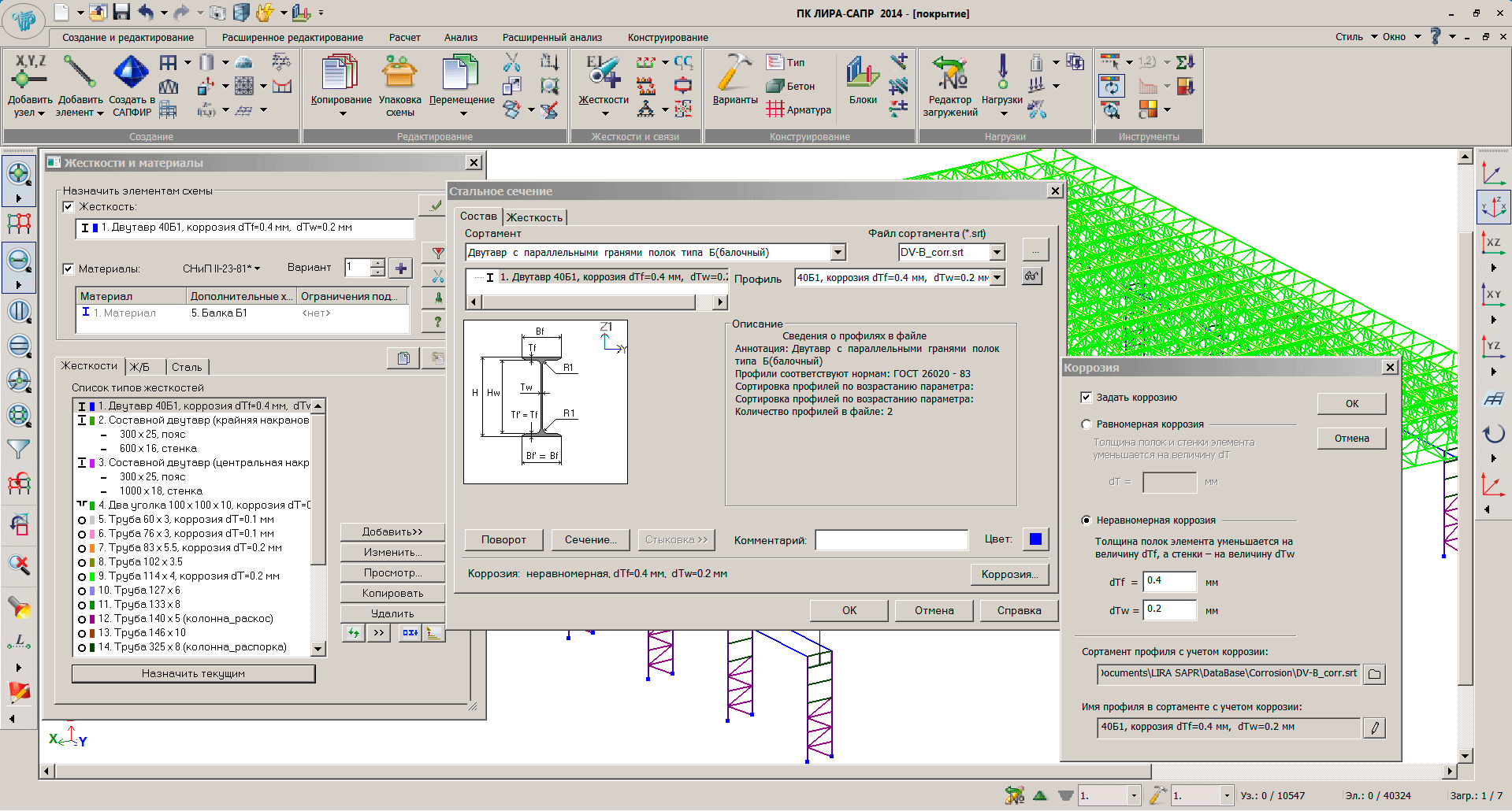 • Разработан новый режим расчета стальных конструкций «Коррозия». Для сечений стальных элементов имеется возможность указать глубину коррозии в миллиметрах. В этом случае в автоматическом режиме вычисляются новые геометрические характеристики с учетом утонения от коррозии, которые учитываются как при статическом и динамическом расчетах, так и при проверке в системе СТК-САПР;