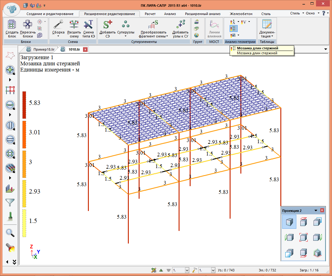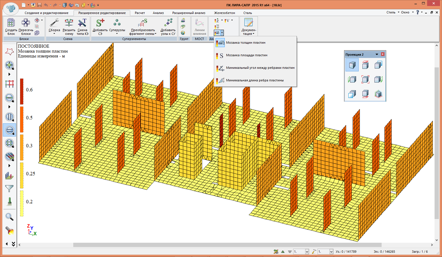 - мозаики для анализа геометрии расчетной схемы (мозаики координат узлов Х, Y, Z, мозаики длин стержней, мозаики параметров пластин (толщин пластин, площади пластин, минимальный угол между ребрами пластин, минимальная длина ребра пластины), мозаика параметров объемных КЭ (объем объемного КЭ, минимальная площадь грани объемного КЭ));