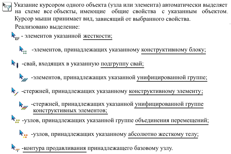 2. Реализован инструмент «Указание курсором», позволяющий для объекта (узла или элемента) автоматически выделять на схеме все объекты, имеющие общие аналогичные свойства с указанным объектом. При этом в списке соответствующего диалога выделяется строка, представляющая свойства этих объектов. Инструмент «Указание курсором» реализован в диалоговых окнах, содержащих и отображающих информацию в виде списков.