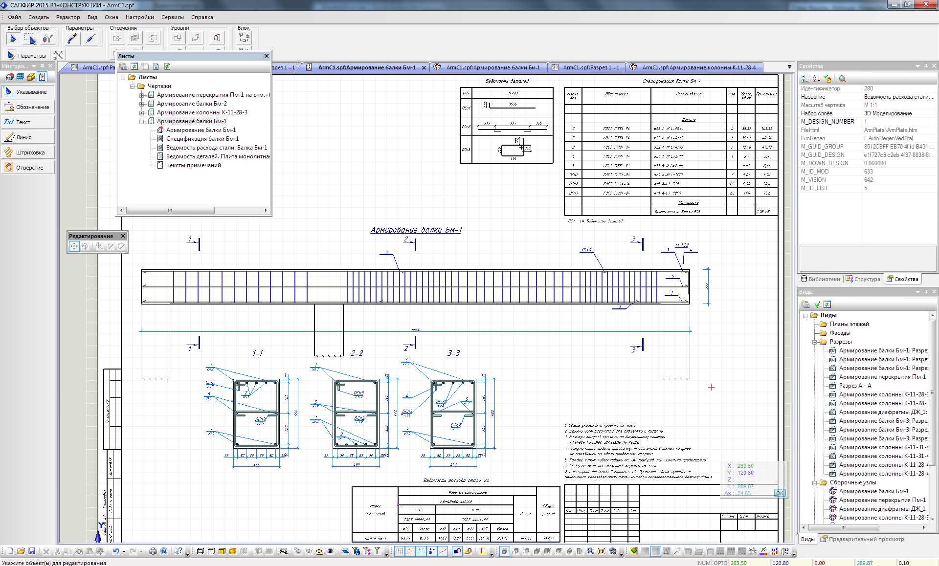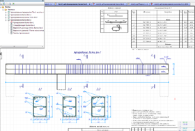Для балок создаются рабочие чертежи армирования со спецификацией, ведомостью деталей и ведомостью расхода стали. В автоматическом режиме выполняется образмеривание поперечных сечений балок с учетом положения стержней рабочей арматуры и простановка выносок с позициями деталей.
