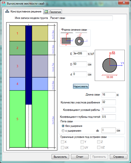 Задаются материал, форма, размеры сечения ствола сваи, ее длина, наличие или отсутствие расширения под пятой сваи, а также количество участков разбиения сваи и коэффициент условий работы. Задаются характеристики слоев грунта вдоль ствола и под пятой сваи.