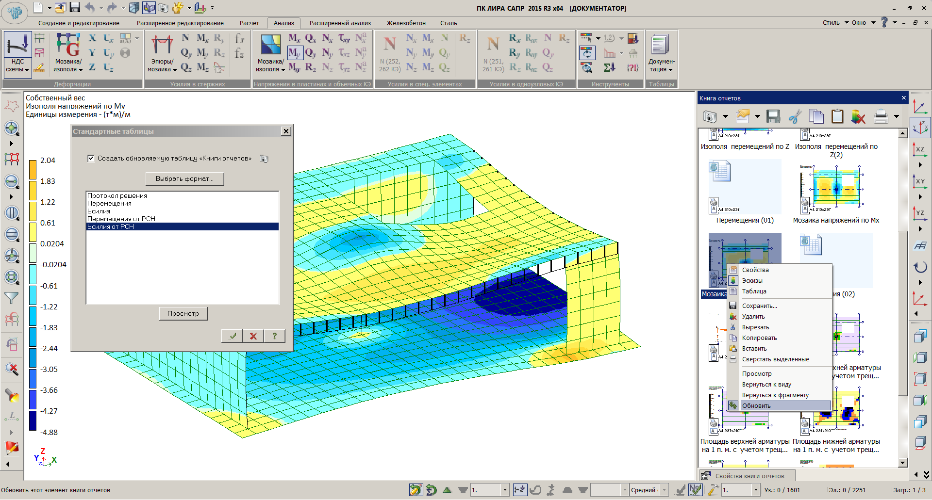 Новая система документирования «Книга отчетов» включает интерактивные копии экранов расчетной схемы и концептуально новые таблицы результатов МКЭ и ж/б расчета. Интерактивная копия экрана способна в любой момент времени возвращать расчетную схему к виду или фрагменту, хранящемуся в ее изображении. Новые таблицы обеспечивают полноценный анализ результатов расчета схемы с помощью таблиц. И копии экранов, и таблицы способны автоматически обновлять свое содержимое вслед за изменениями расчетной схемы. «Книга отчетов» позволяет организовывать свои элементы в иерархическую древовидную структуру, добавлять произвольный текст и графические изображения. Элементы книги отчетов могут быть сверстаны в единый файл формата DOCX и распечатаны.