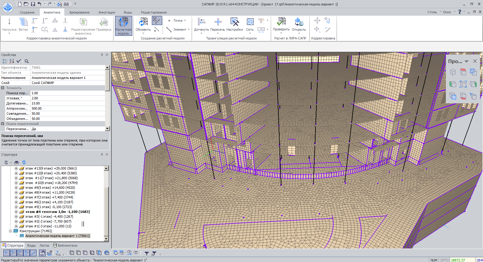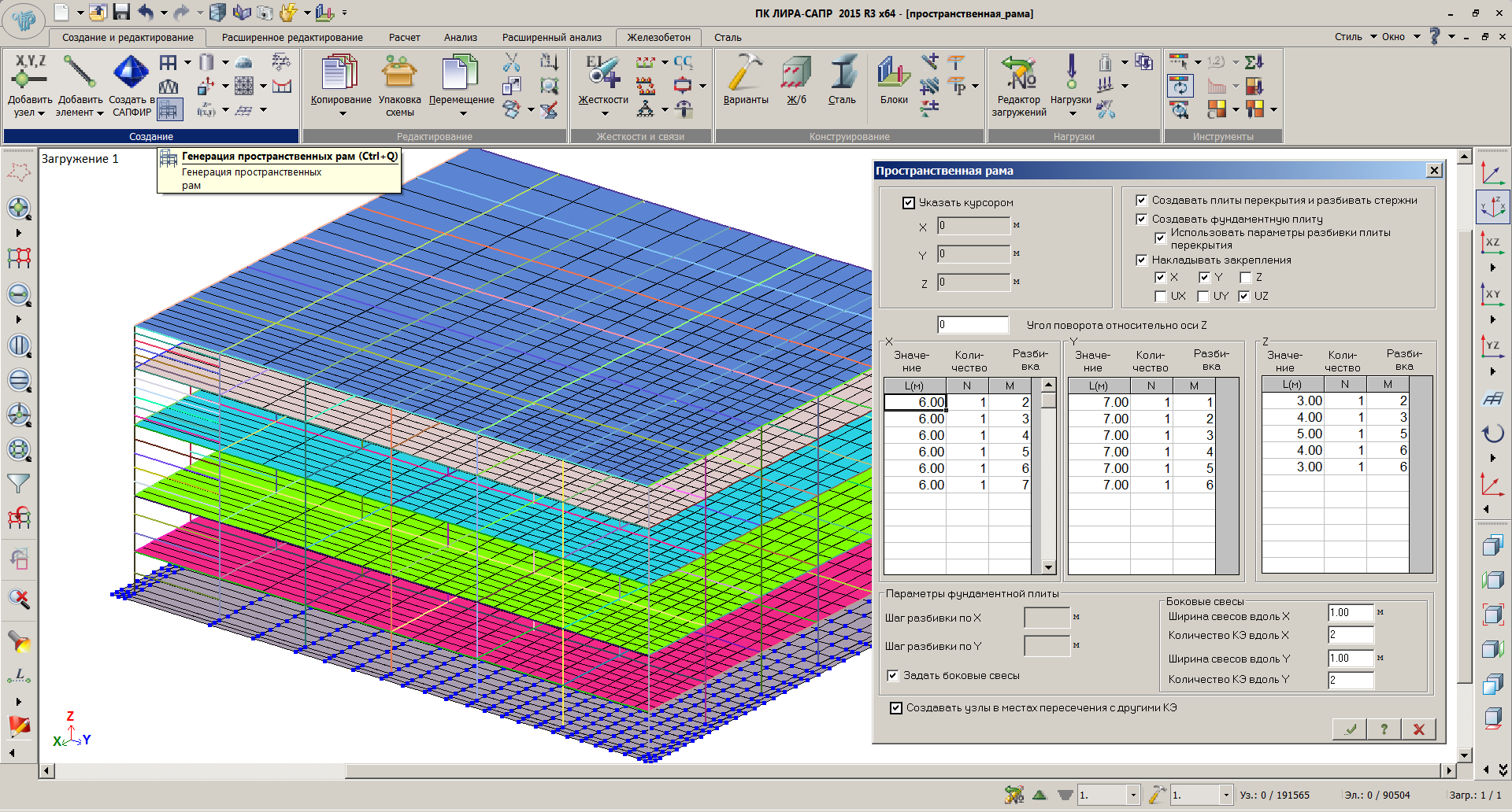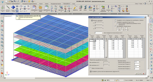 Получила развитие система параметрической генерации пространственных рам. Реализовано задание различной конечно-элементной разбивки колонн, балок и плит перекрытий на разных высотных уровнях. Также добавлена возможность формирования фундаментной плиты, согласование ее разбивки с сеткой колонн и назначение необходимых закреплений.