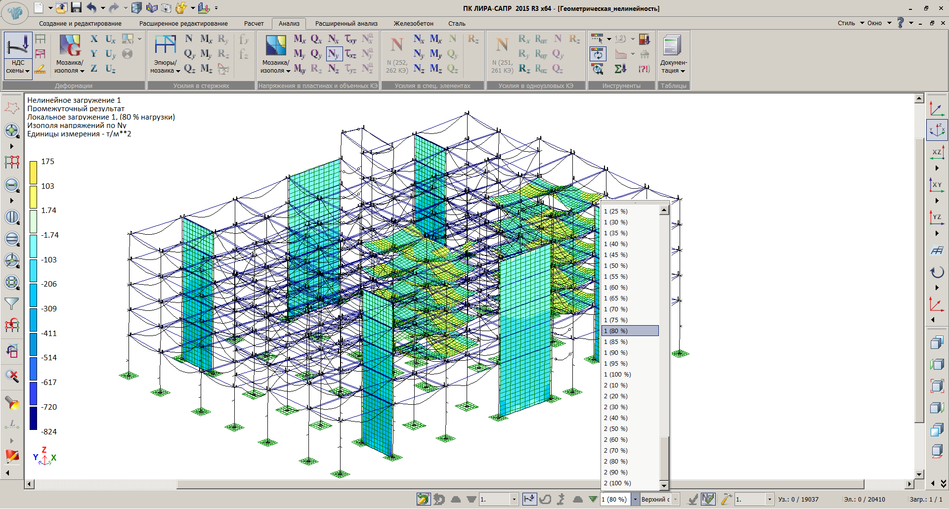Графическое представление результатов на каждом шаге, для геометрически нелинейных результатов позволяет значительно упростить анализ полученных результатов.