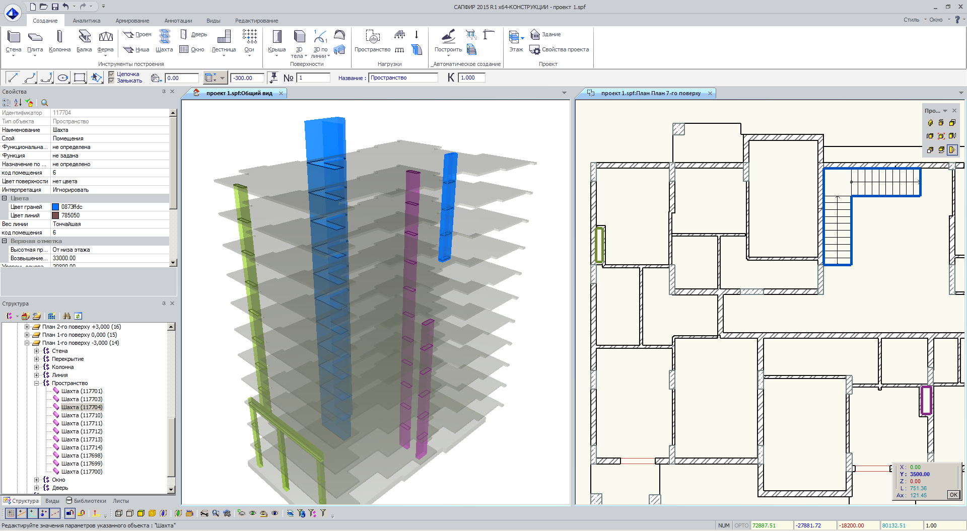 Для моделирования лифтовых шахт и вентиляционных каналов разработан инструмент, позволяющий создать единый проем через несколько плит. При этом сохраняется ассоциативность объектов – при редактировании контура исходного объекта, изменяется контур проема в плитах.