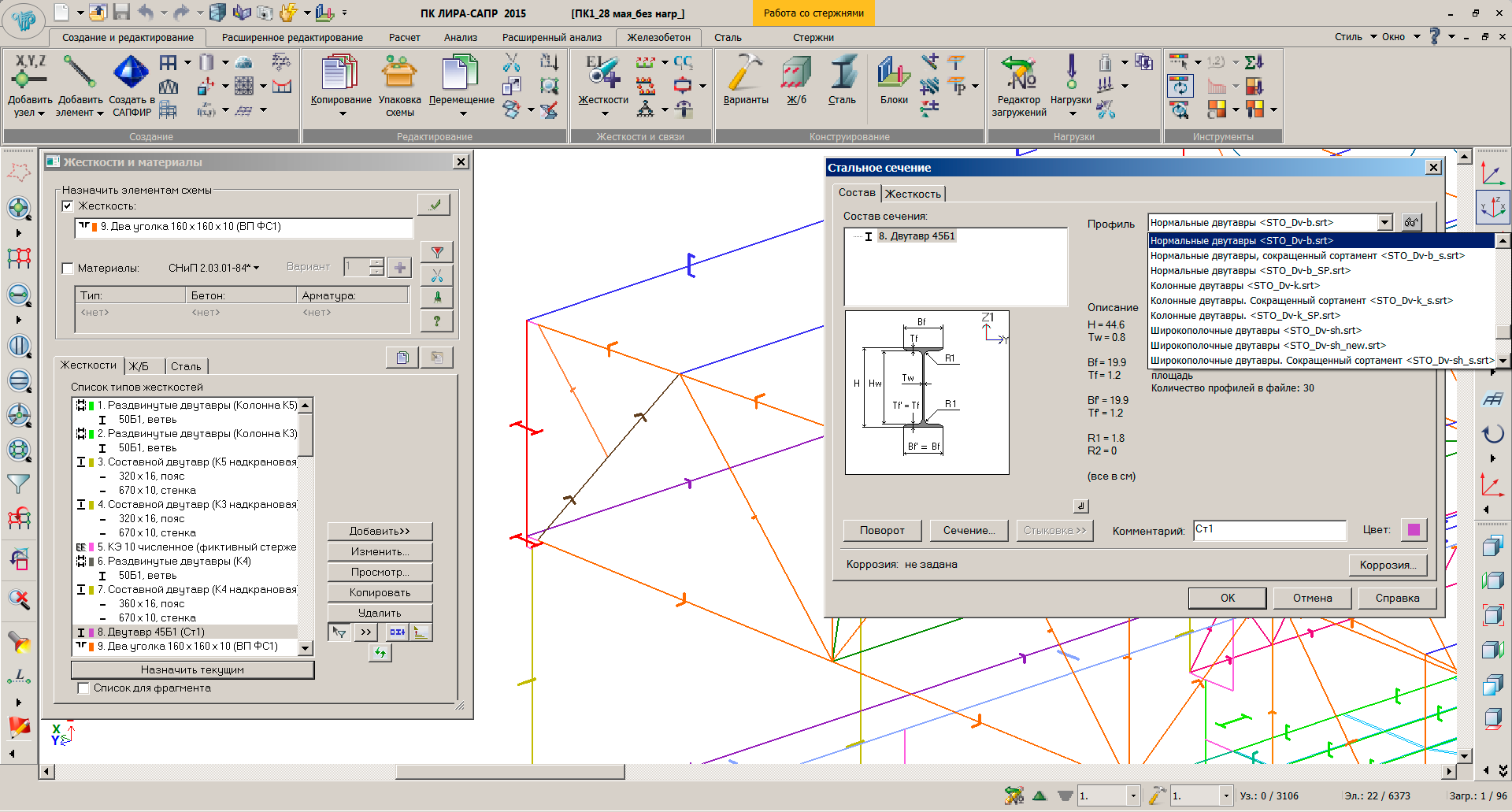 В версии 2015 материал стального элемента можно задавать независимо от того, из какого сортамента были заданы профили стального сечения. Новые возможности можно использовать во всех системах ПК ЛИРА-САПР 2015, «СТК-САПР», «ВИЗОР-САПР», «САПФИР», «КМ-САПР», «РС-САПР». Задачи предыдущих версий открываются и считаются без изменений.