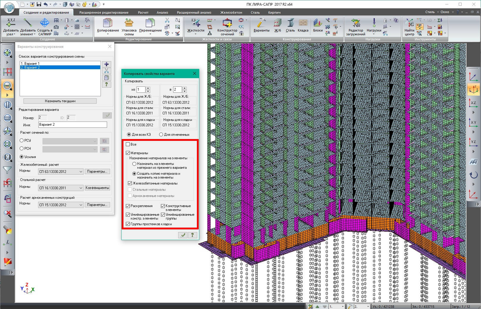 • Для железобетонных и стальных материалов реализовано расширенное копирование и назначение материалов между вариантами конструирования в диалоге "Копировать свойства варианта". Копирование свойств варианта конструирования.jpg