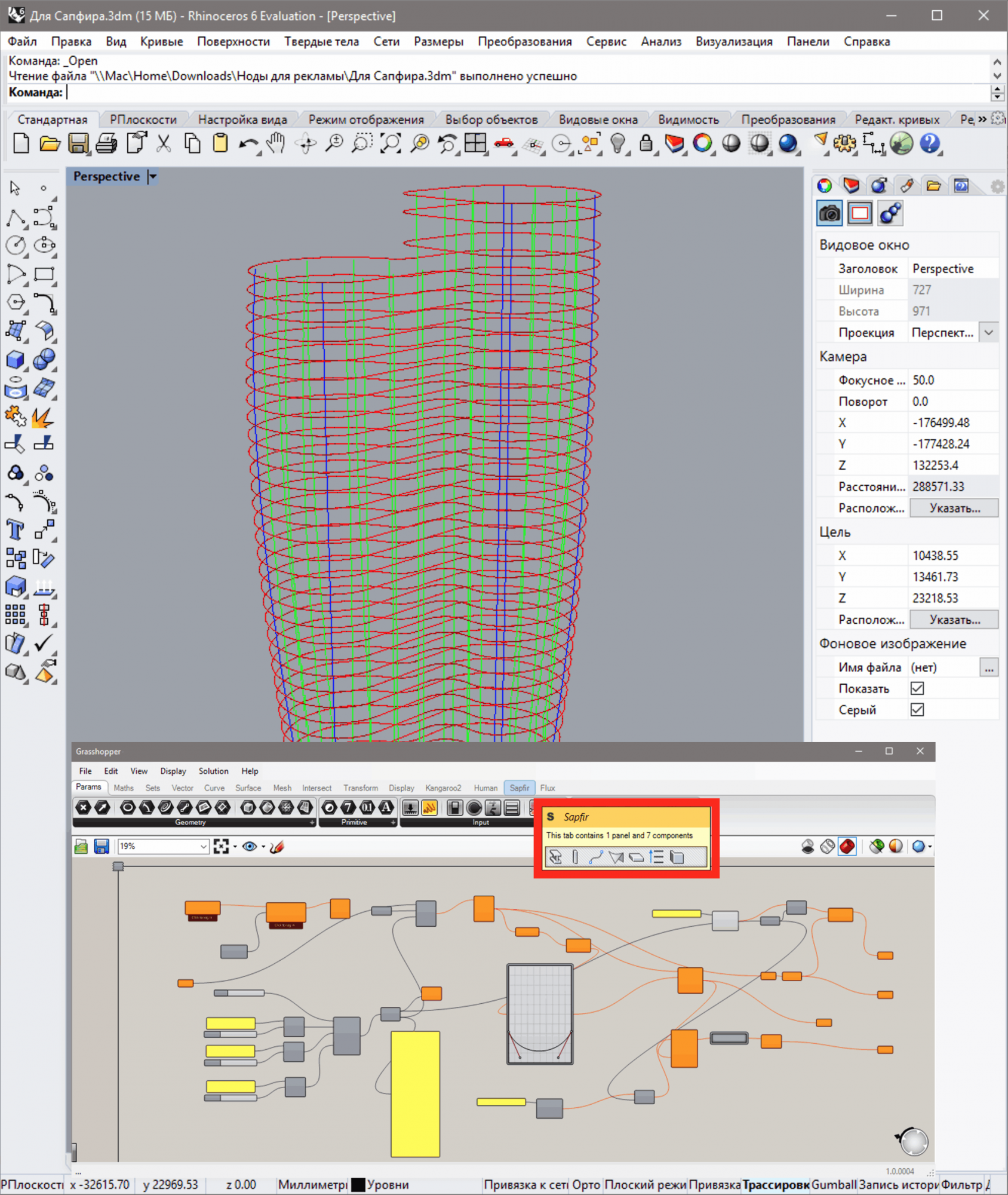 Этот инструмент позволяет Rhino, Grasshopper и САПФИР-3D совместно работать с целью создания и управления моделью BIM через визуальный интерфейс сценариев Grasshopper.