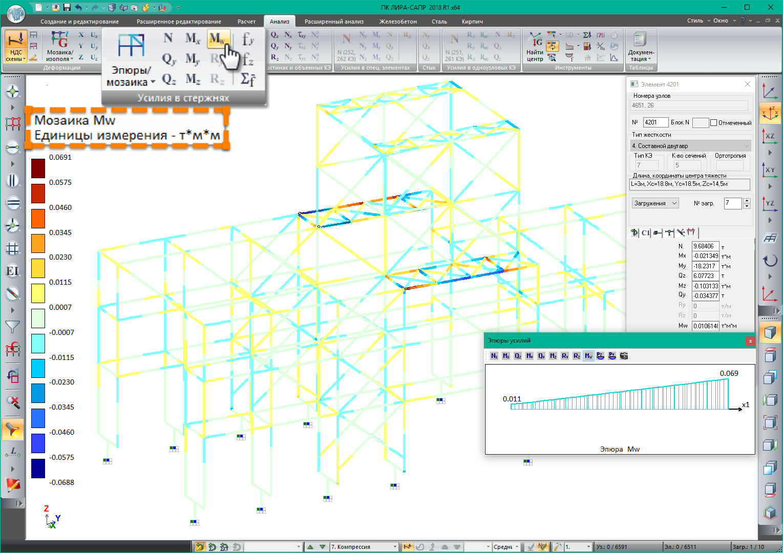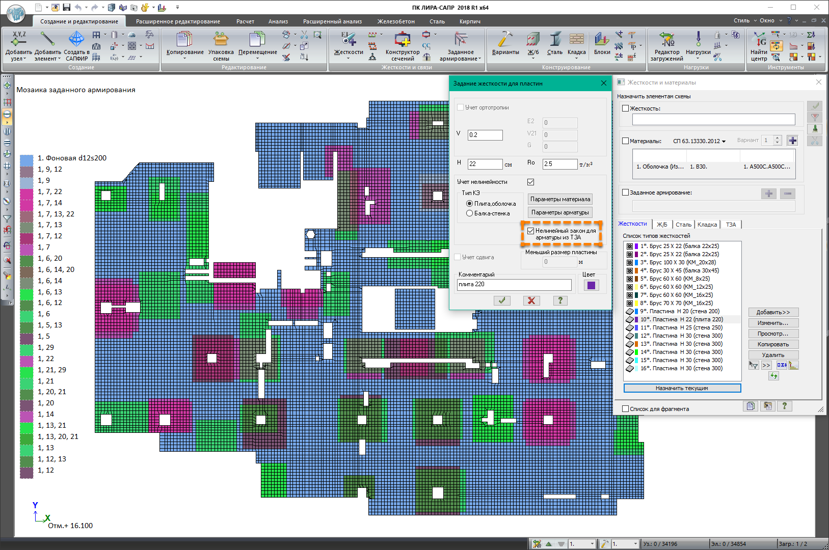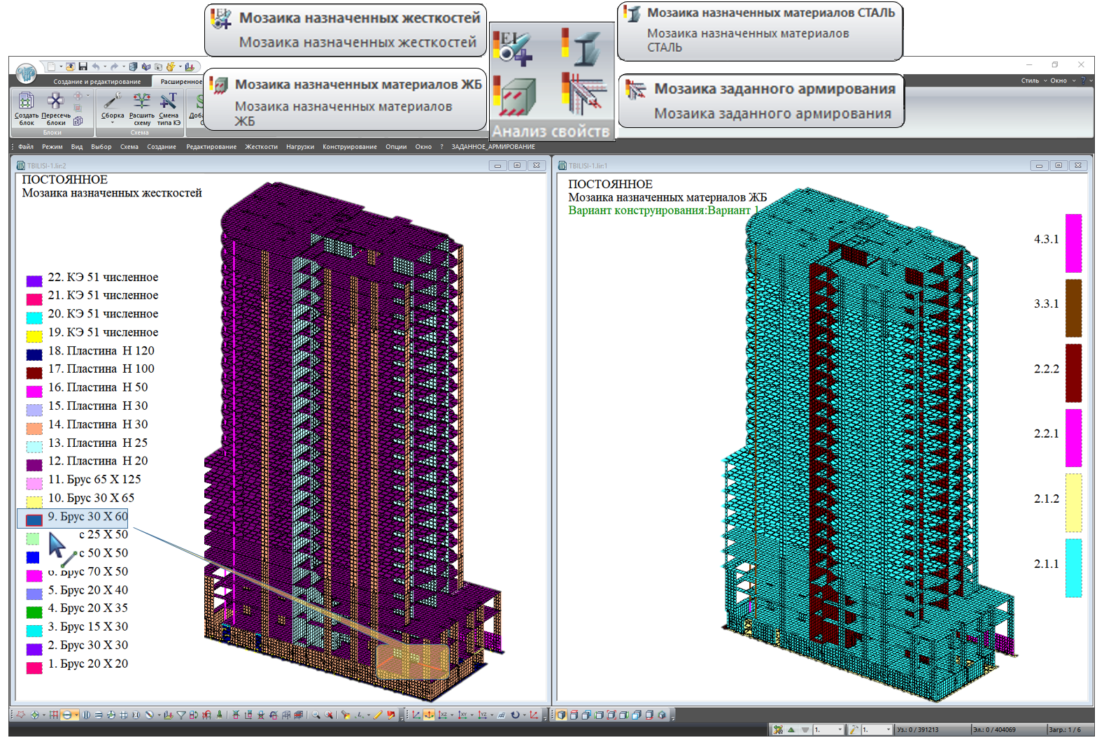 Для анализа исходных данных реализованы новые режимы мозаик назначенных свойств элементов, таких как жесткости, материалы, заданное армирование. Теперь отметить все объекты с одинаковыми свойствами можно одним кликом на цветовой шкале.