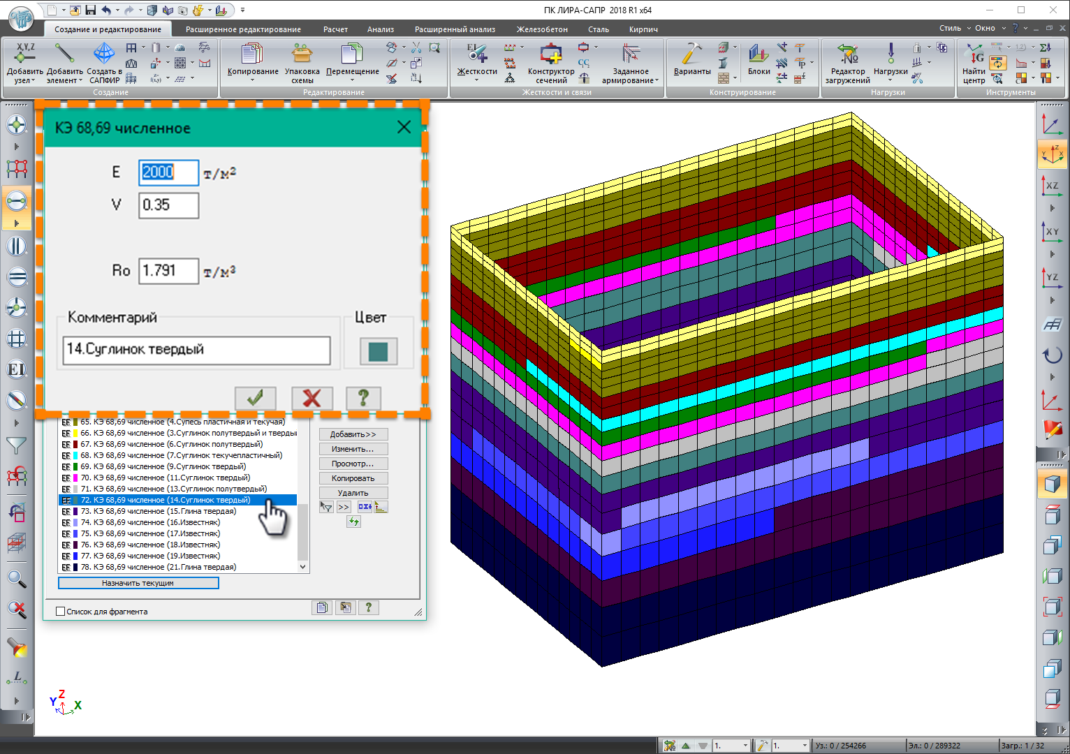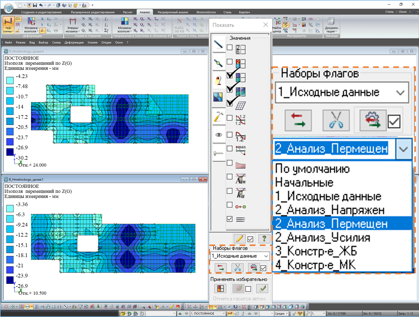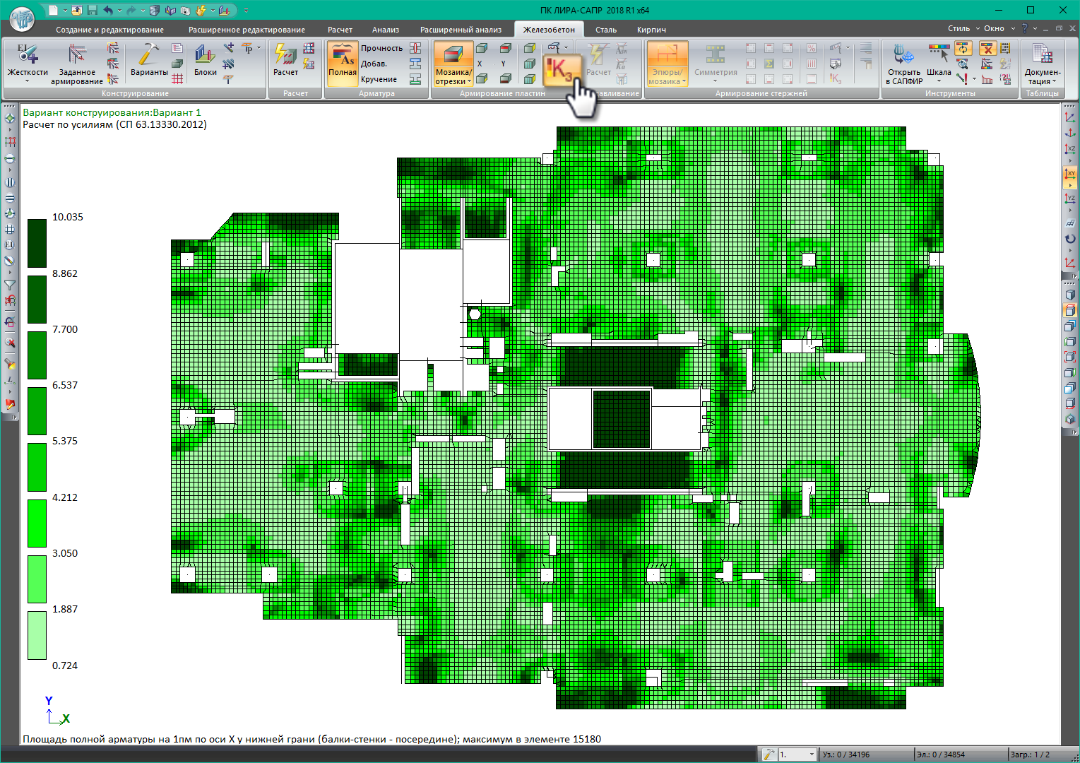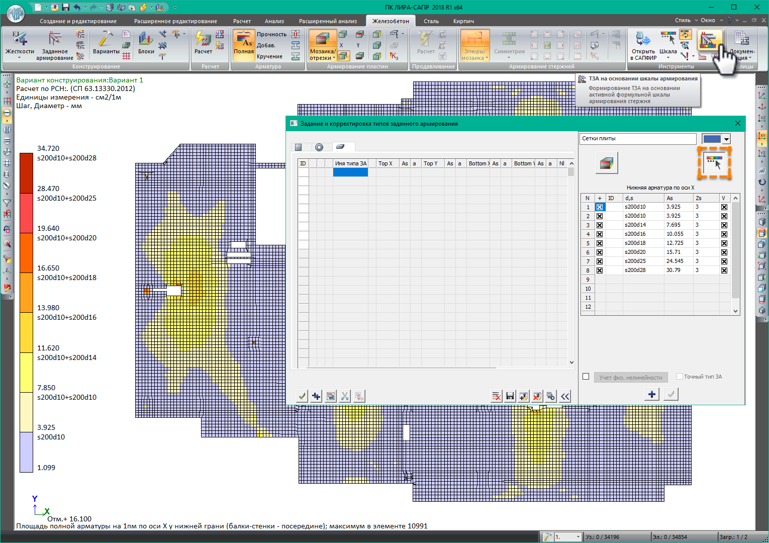 Для анализа исходных данных реализованы новые режимы мозаик назначенных свойств элементов, таких как жесткости, материалы, заданное армирование. Теперь отметить все объекты с одинаковыми свойствами можно одним кликом на цветовой шкале.