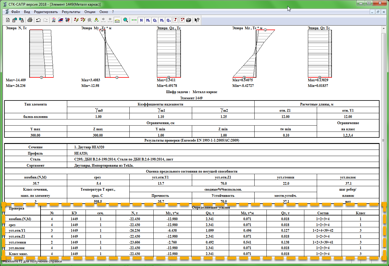 В локальном режиме СТК-САПР для EuroCode 3 добавлена информация об определяющих усилиях, которые были использованы при проверке/подборе стального сечения. Данная возможность значительно упрощает анализ полученных результатов, а также позволяет оценить вклад каждого загружения или комбинации нагрузок.
