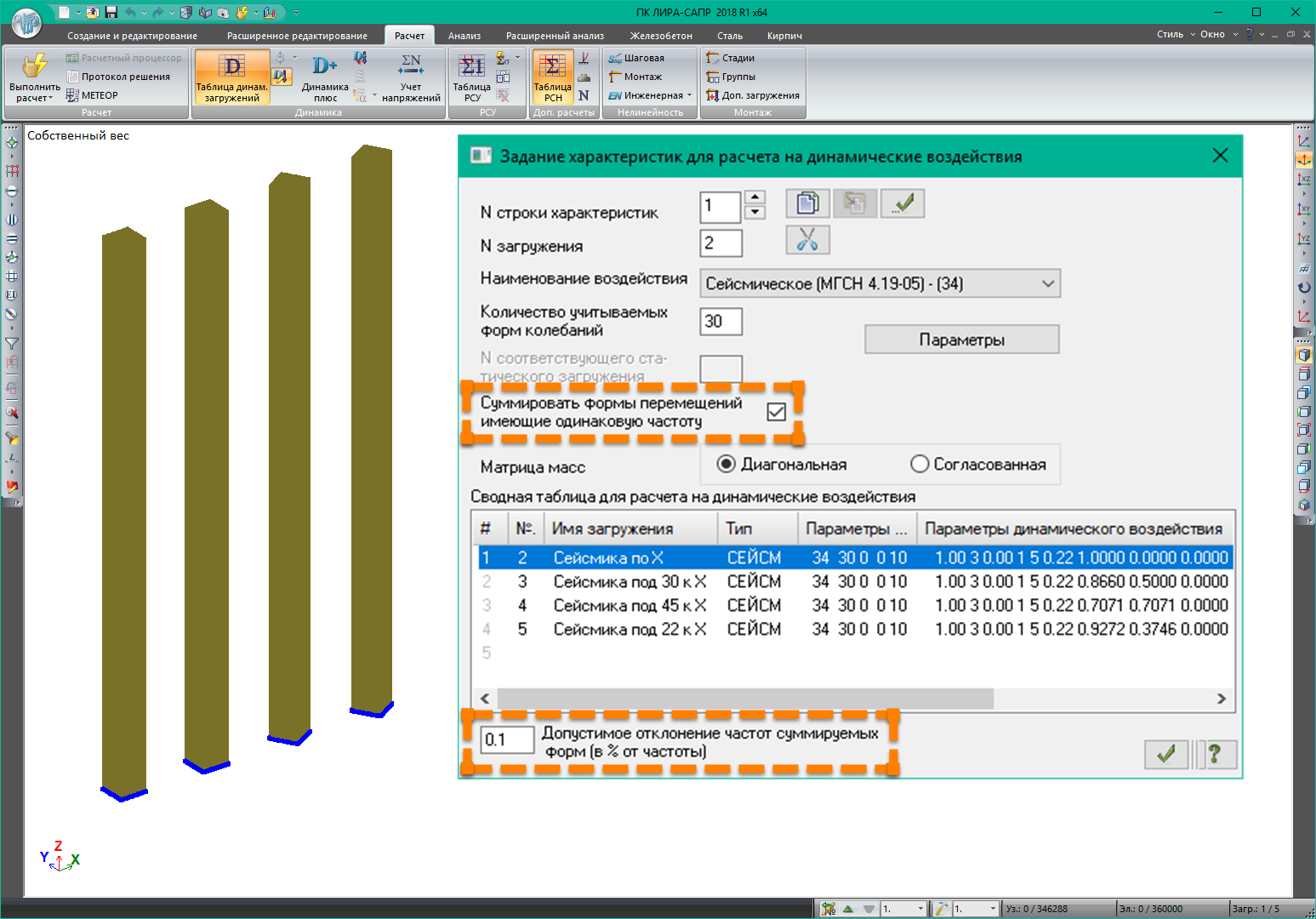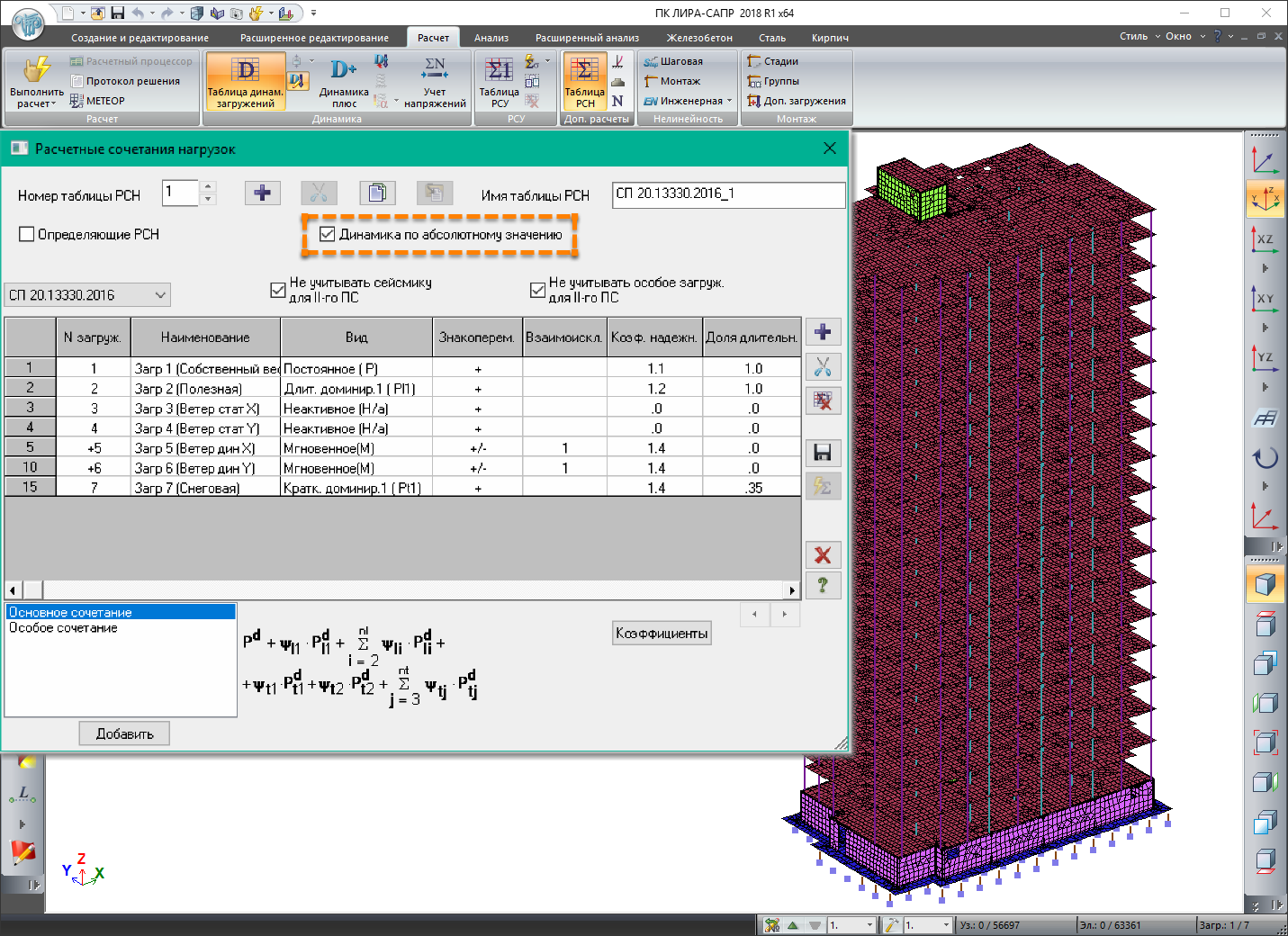 В свойствах таблиц РСН добавлена опция «Динамика по абсолютному значению», которая позволяет при расчете РСН определять суммарные значения перемещений и усилий для динамических загружений по модулям их составляющих. Если флажок не установлен, то суммарные значения будут вычисляться с учетом знаков их составляющих. При этом знак суммарного значения будет соответствовать знаку максимальной по модулю составляющей, а при пульсации ветра – знаку статической составляющей.