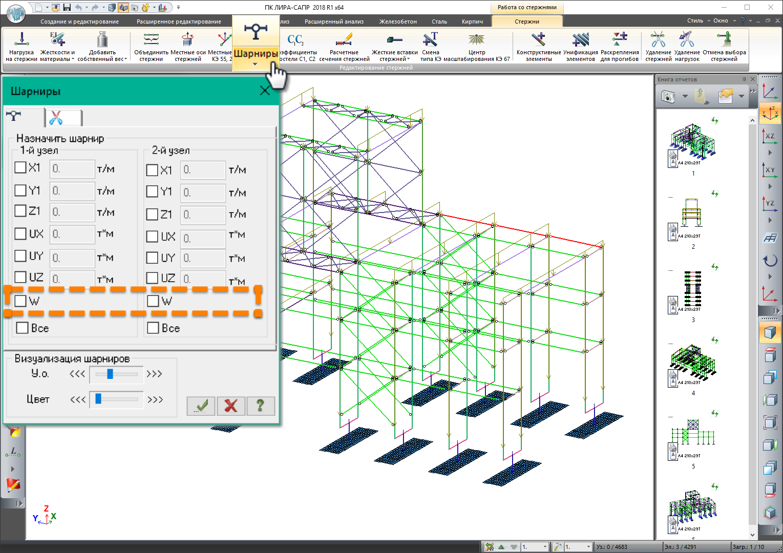 - таблица шарниров, в которой представлены расположение шарниров в расчетной схеме, направления их действия и значения жесткости