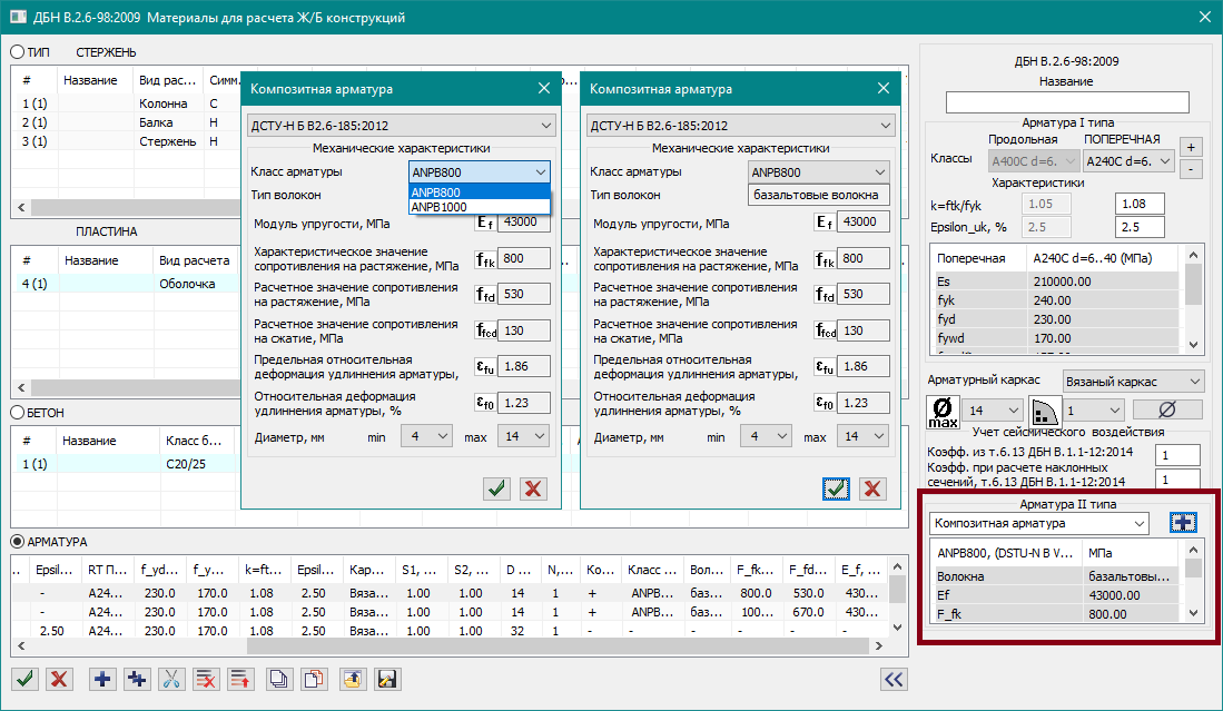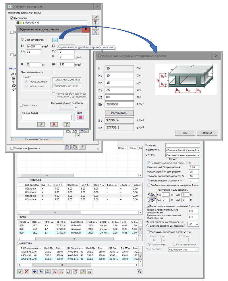 - таблицы характеристик железобетонных и стальных материалов, используемых в расчетной модели.